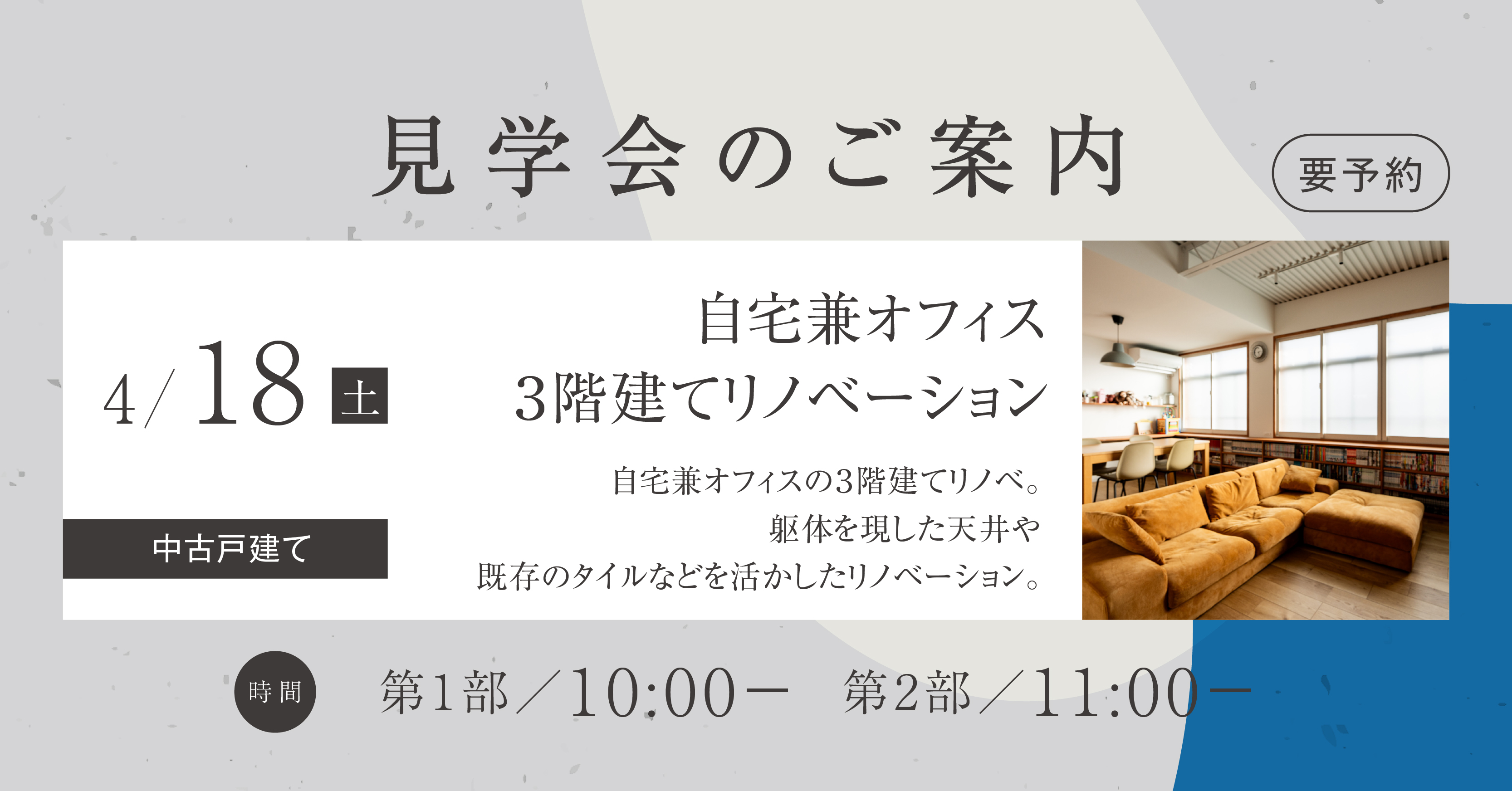 開催日時: 4/18(土) 10:00-/11:00- 自宅兼オフィスの3階建てリノベーション