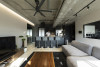 事業主である施主さまは、ご自宅が仕事場でもあります。オンとオフをはっきり区別するというよりは、仕事を生活の一要素ととらえ、公の空間と私の空間にゆるやかな繋がりを残したプランに。公空間であるワークスペースを中心に、私空間であるバーキッチン→ハンモック・リビング→ベッド→トレーニングルームを半円状に配しています。開放感を意識した間仕切りのないワンルームですが、スペースごとの役割を際立たせるため、ほどよく視界が遮られるレイアウトとしました。