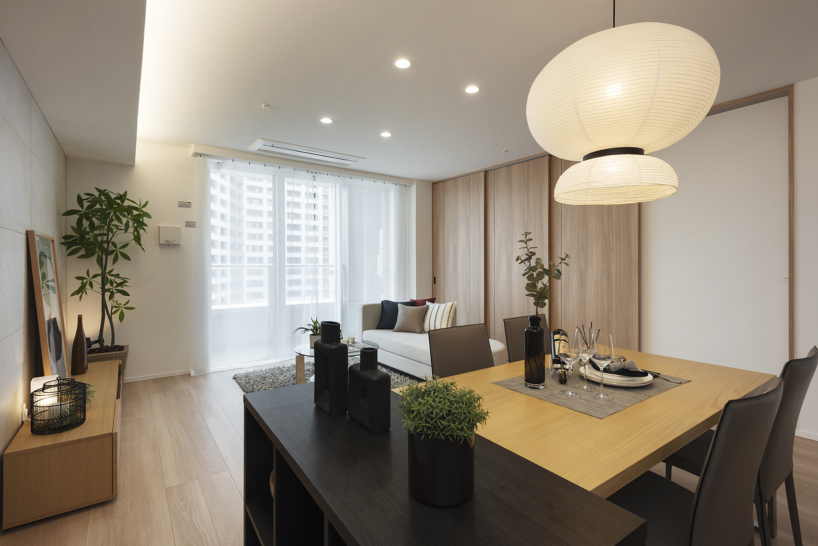 どこか日本的なものを感じさせるペンダントライトはすまいの温かみを感じさせ、安らぎと心地よさを感じさせます。