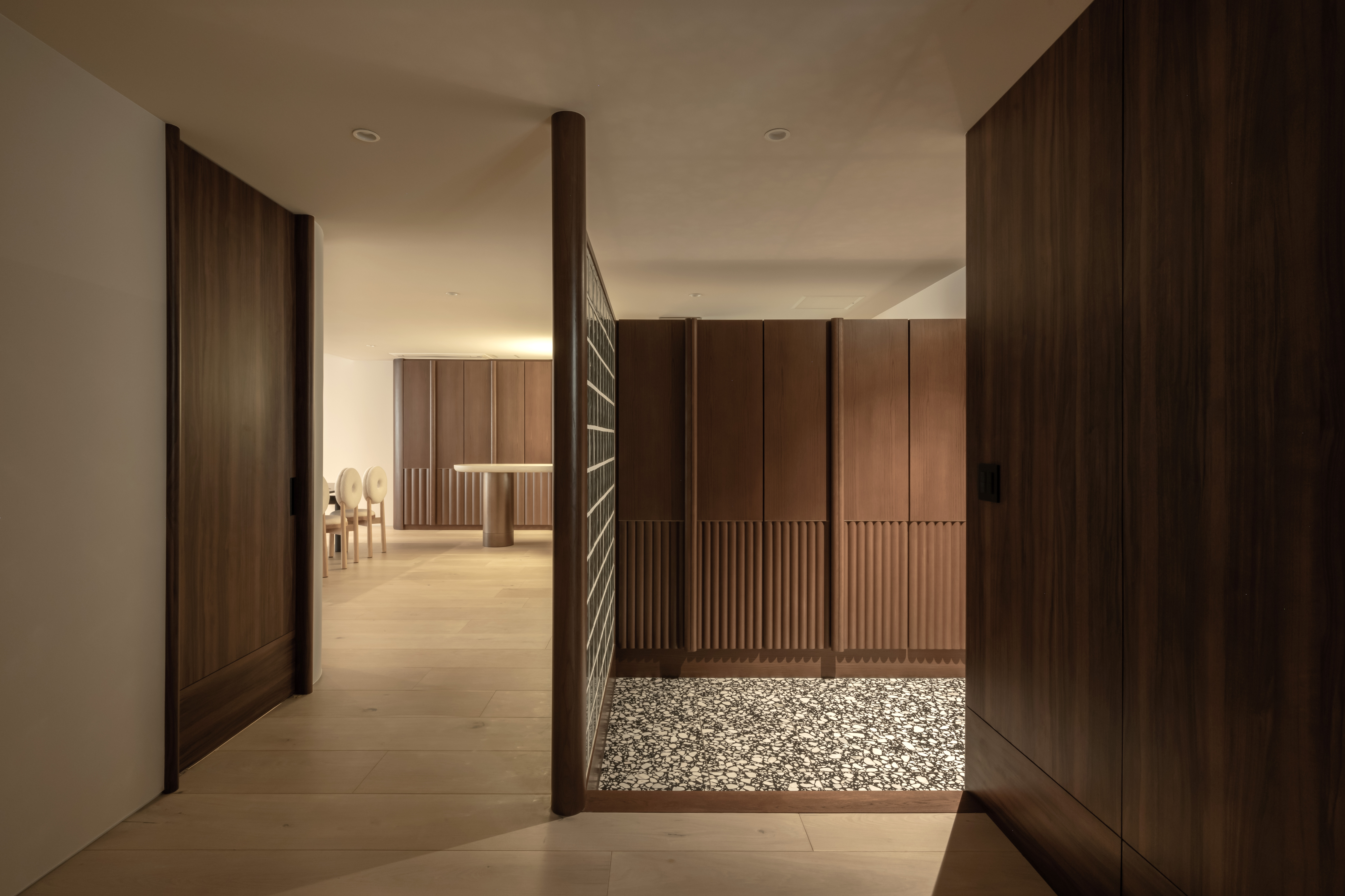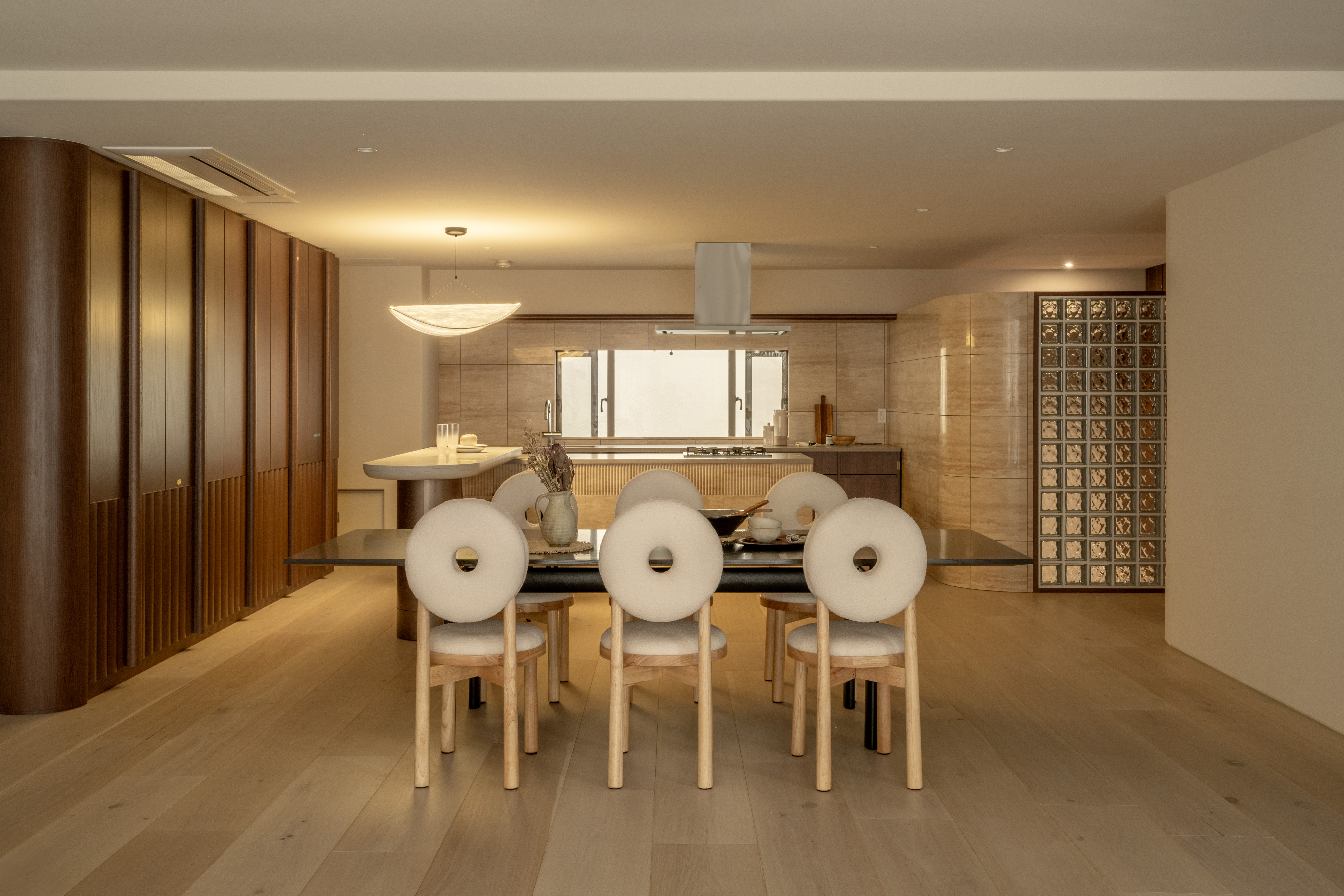 物質的に満たすだけではなく、精神的な充実感や安らぎを感じる、どこにいても感じる視界の抜けと、時間的なゆとりさえも与えてくれる「空間のあき」をつくり、招かれたゲストが上質な時間を過ごせるような空間をつくりました。