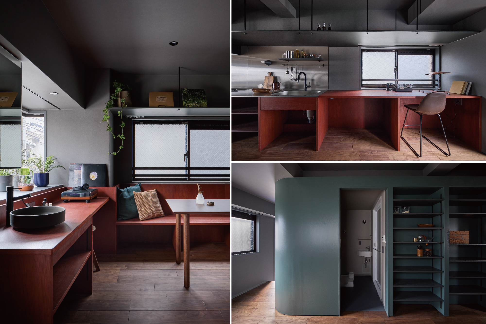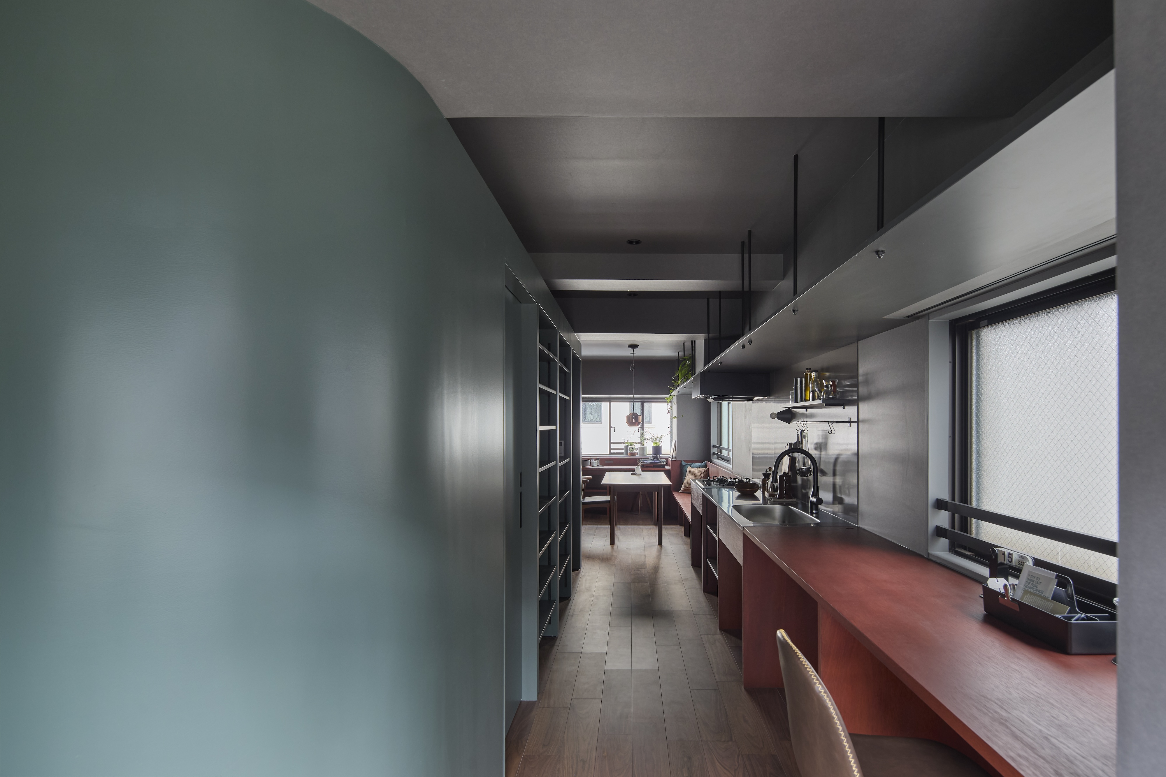 デザインの起点となったのは駒込の街並み。淡いグリーンの壁やレンガ色に染色した造作家具は街の風景から着想を得ており、住まい手の個性を受けとめながらも、街とのつながりを日々感じられる空間を生み出した。