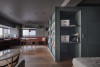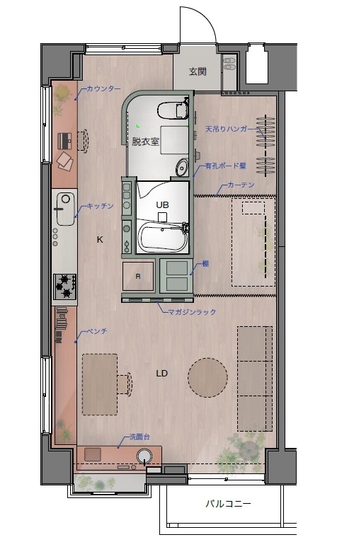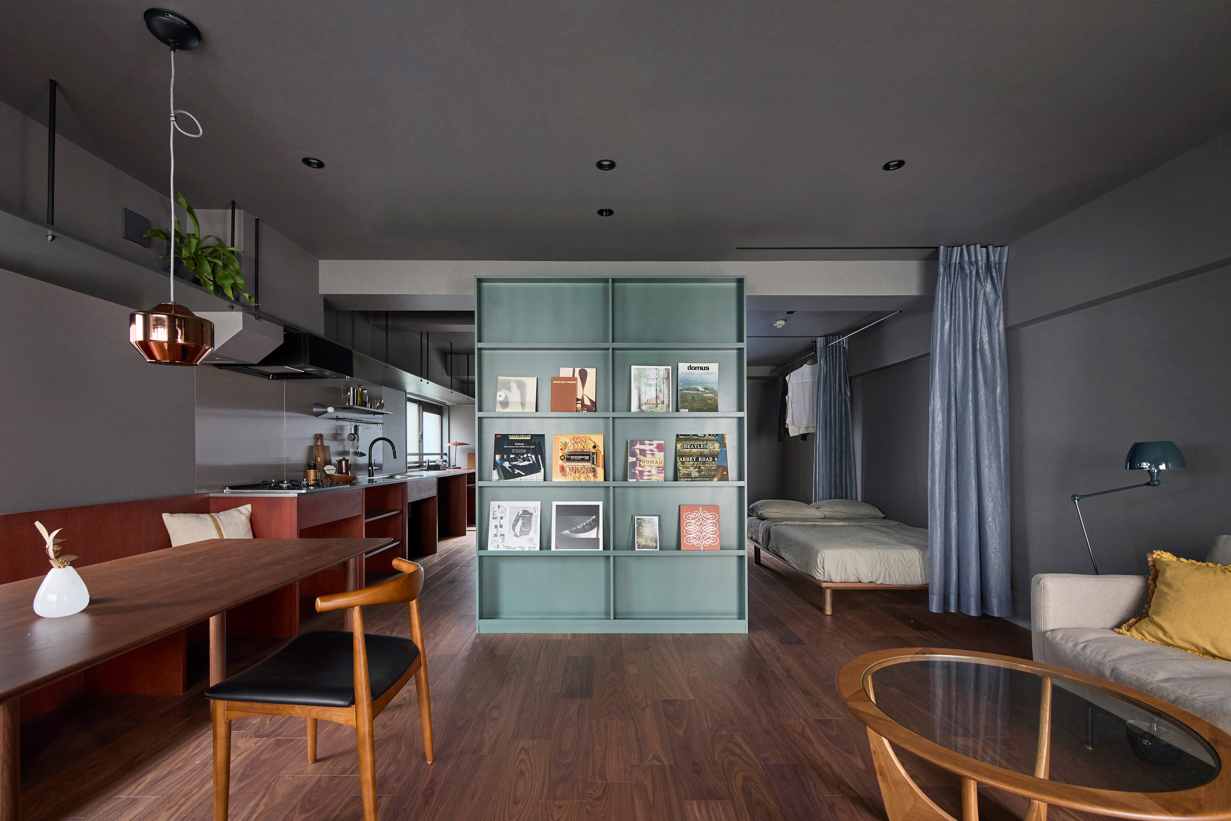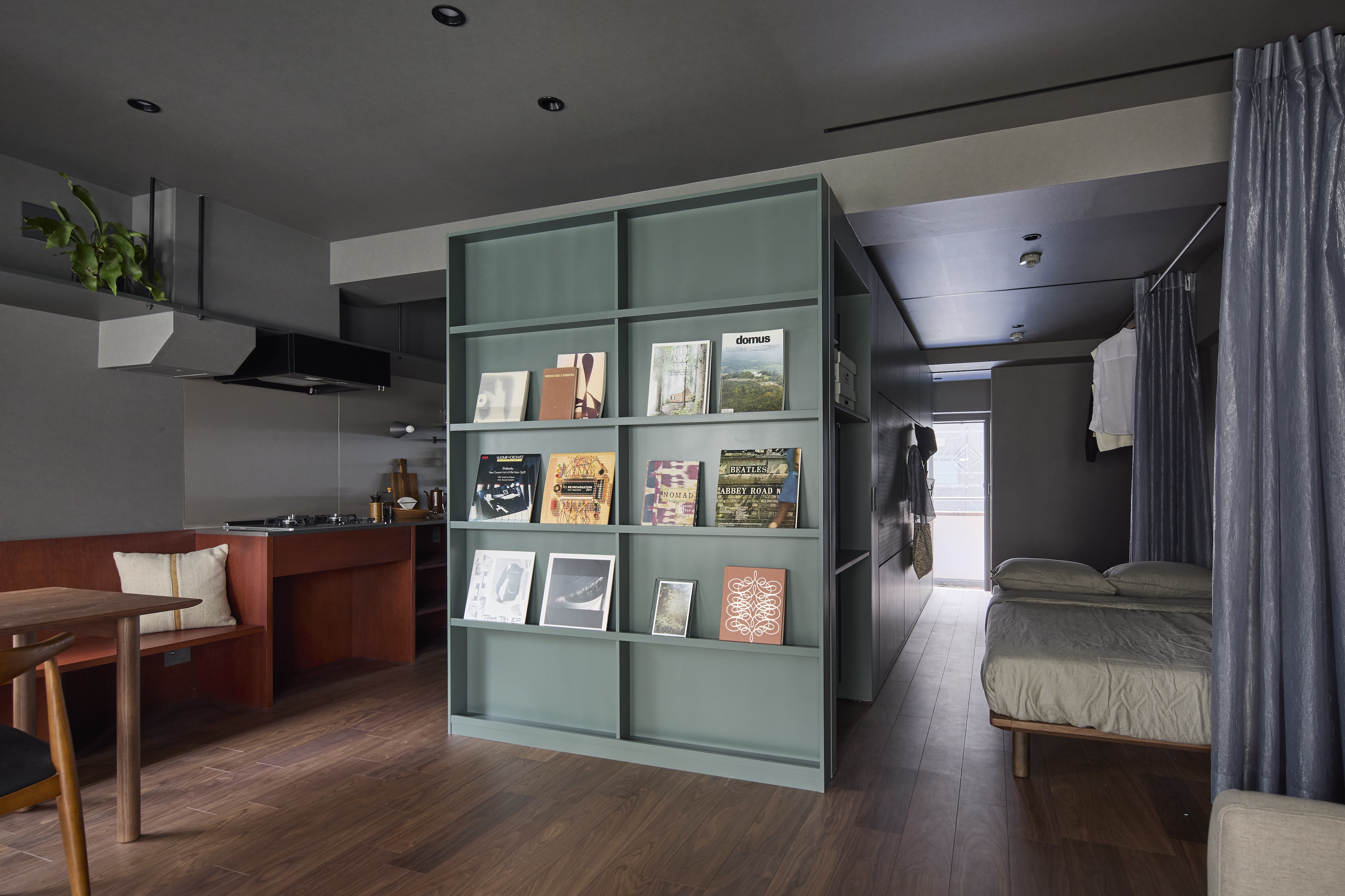空間構成では、3面採光を最大限に活かすため、浴室・脱衣・トイレをあえて住戸中央に配置。水回りコアを中心に回遊できるワンルームとし、壁沿いにカウンターやキッチン、ベンチ、マガジンラック、有孔ボードを設えることで、お気に入りのものに囲まれた暮らしを可能にした。さらにカーテン間仕切りにより、広々としたLDKからベッドスペースや書斎、収納へと自在に切り替えられ、多様な住み方を実現する。