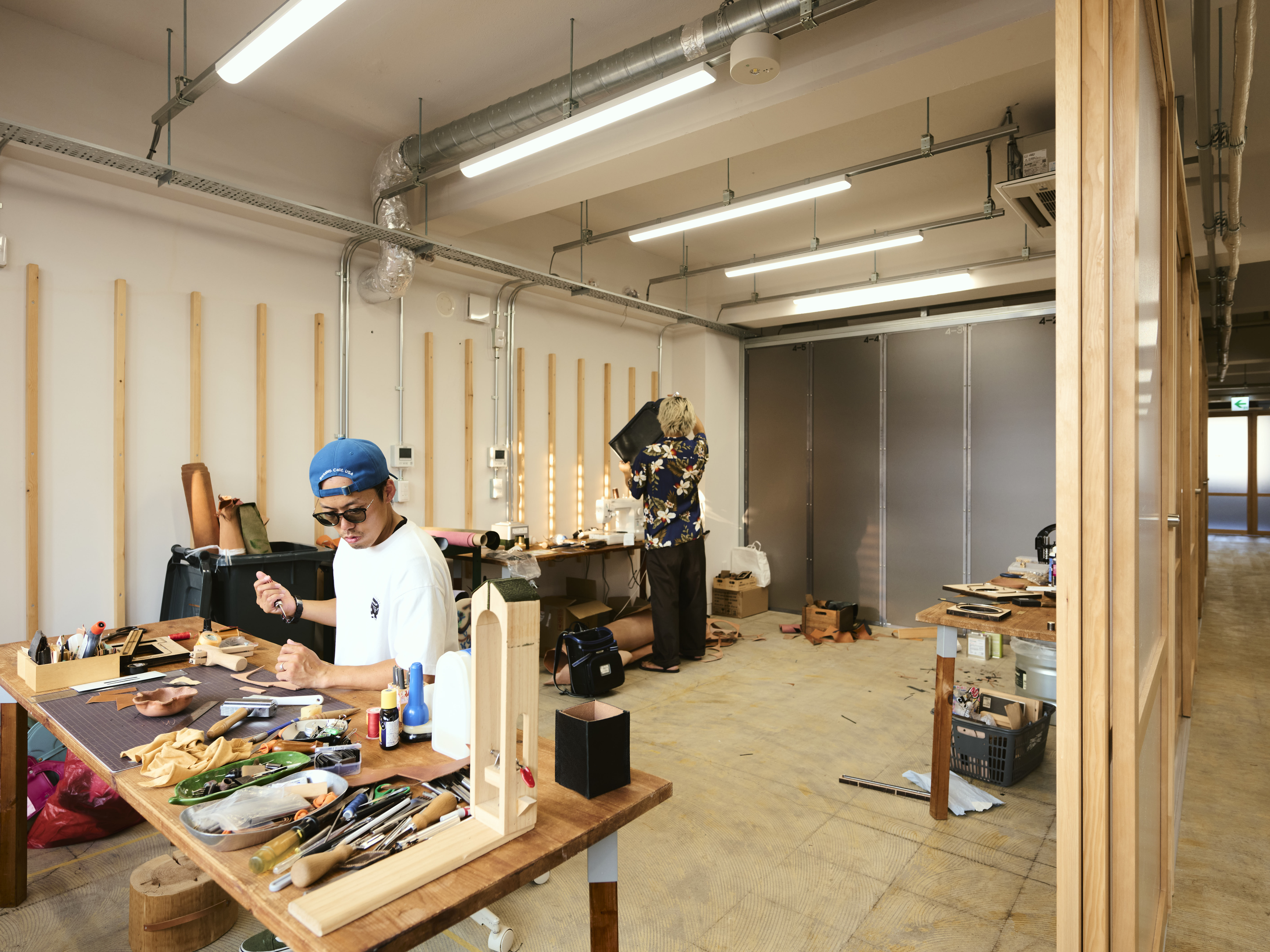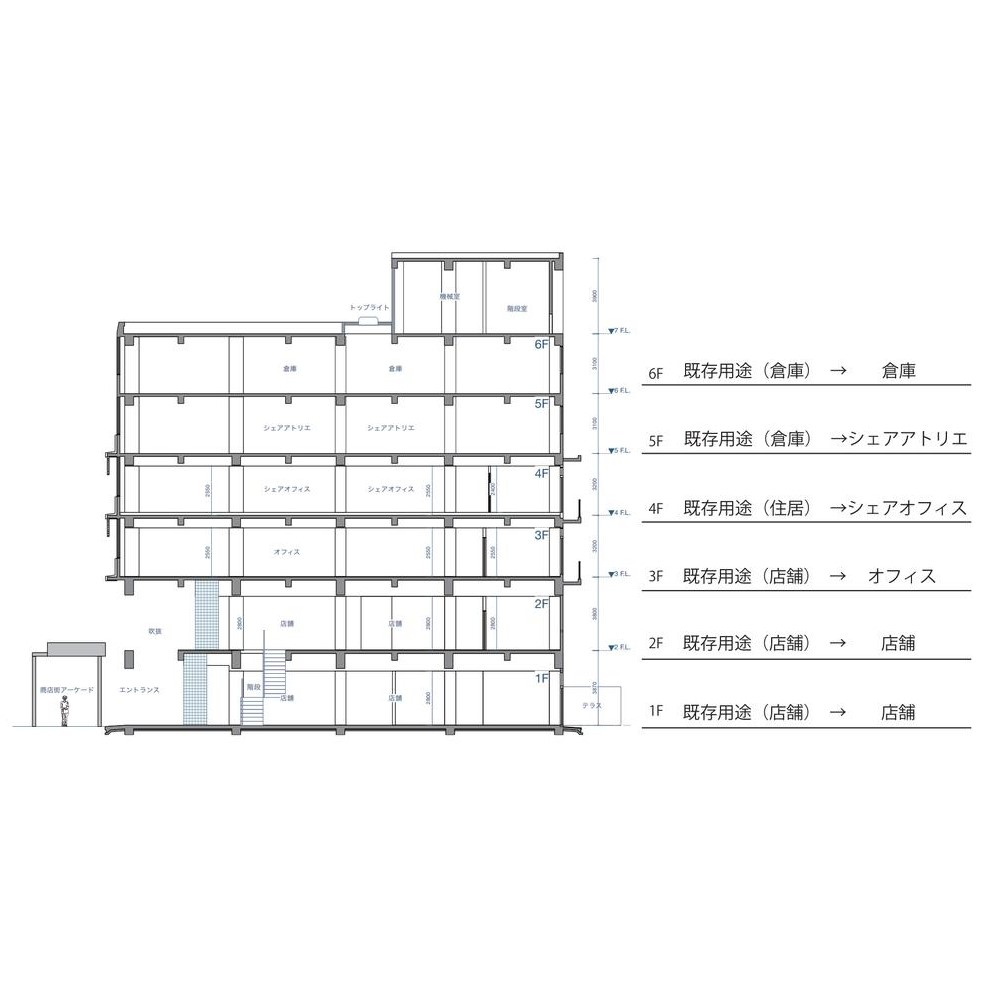 再生後のビルは多層的な機能を備えています。1〜2階には行列を生むカフェとフラワーショップを誘致し、3階はアートディレクターを中心に多様なクリエイターが集う共創空間に。4階はシェアオフィス、5階はアトリエ、6階は多目的倉庫として活用。吹き抜けのエントランスには地域や仏壇業界とコラボする壁面を設けました。