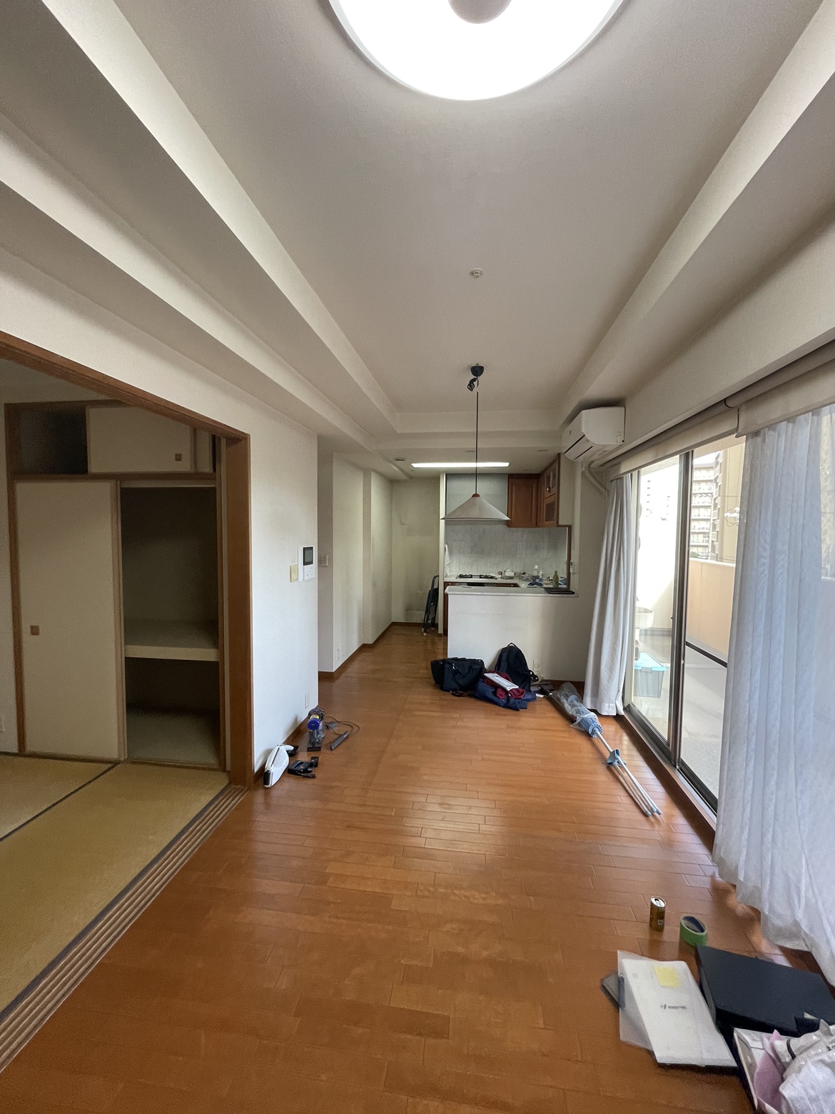 約8,100mmのスパンを持つワイドスパン住戸でしたが、そのスペースが十分に活かされていない状況でした。特に和室がリビングを圧迫し、LDK全体が狭く感じられる要因となっていました。この和室の存在により、約13.9帖のLDKの広さを実感できず、居心地の良さが損なわれていました。また、キッチンは約4.4帖の広さがありましたが、その広さを機能的に活かしきれておらず、デザインもLDとの一体感が損なわれているように感じました。