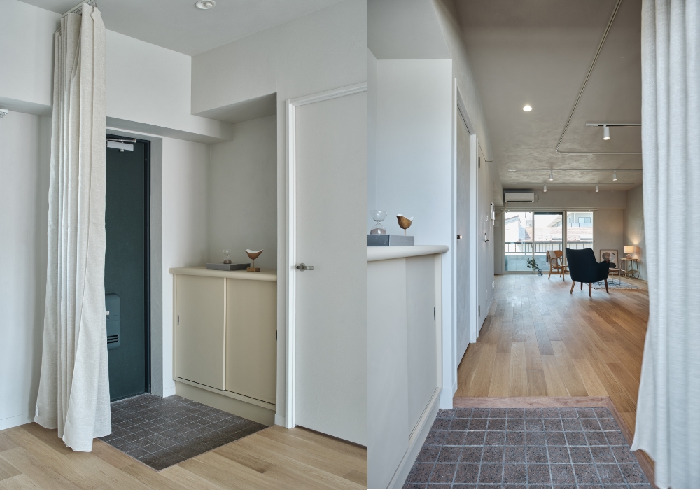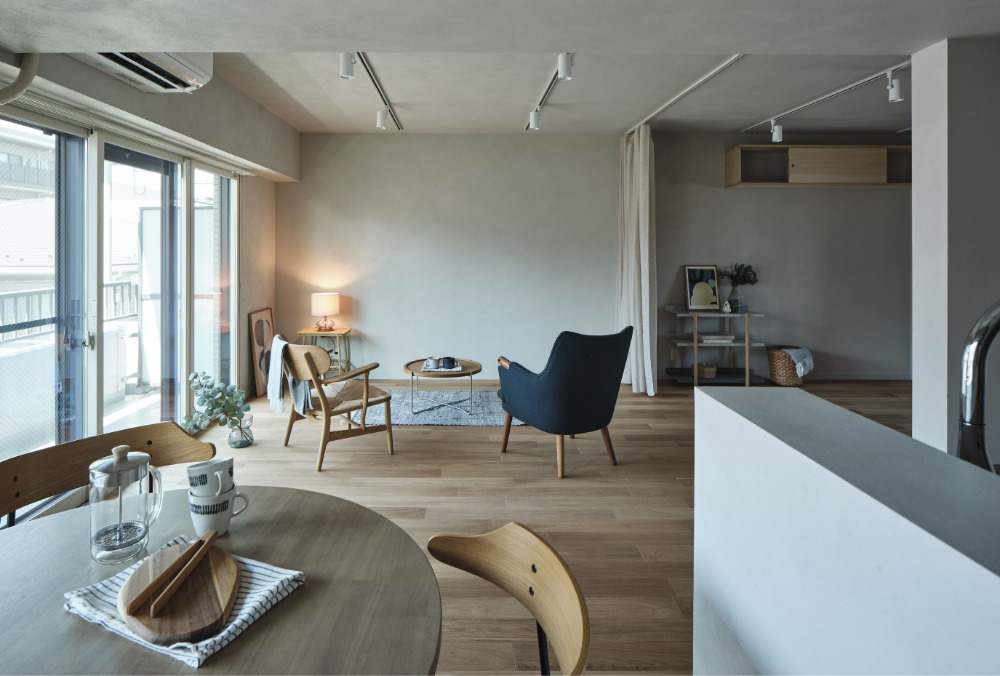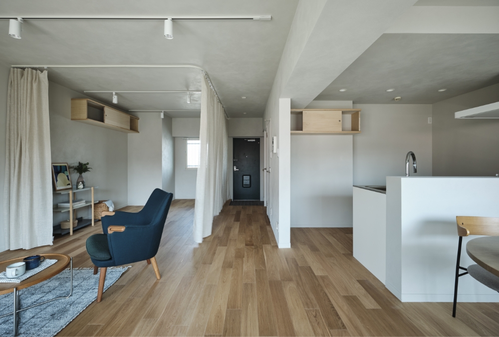 そこで元々備わっていた断熱性能に加えて窓は二重窓+ペアガラスを設置。間取りは3LDKから1LDKに変更し、広いリビングにはカーテンレールを設置して風通しと暮らしの余白を確保した。壁は自然由来で光の陰影が美しい塗料を採用。塗装は原状回復時にゴミが出ず、タッチアップでメンテナンスが出来る。さらに「家に関心を持つ人を街に増やしたい」という想いから、4日間の塗装ワークショップを開催。地元の建築家、地主、DIY好き、夏休みの子供たちまでが集い、汗を流して仕上げた空間は、参加者にとっても愛おしい場所となった。