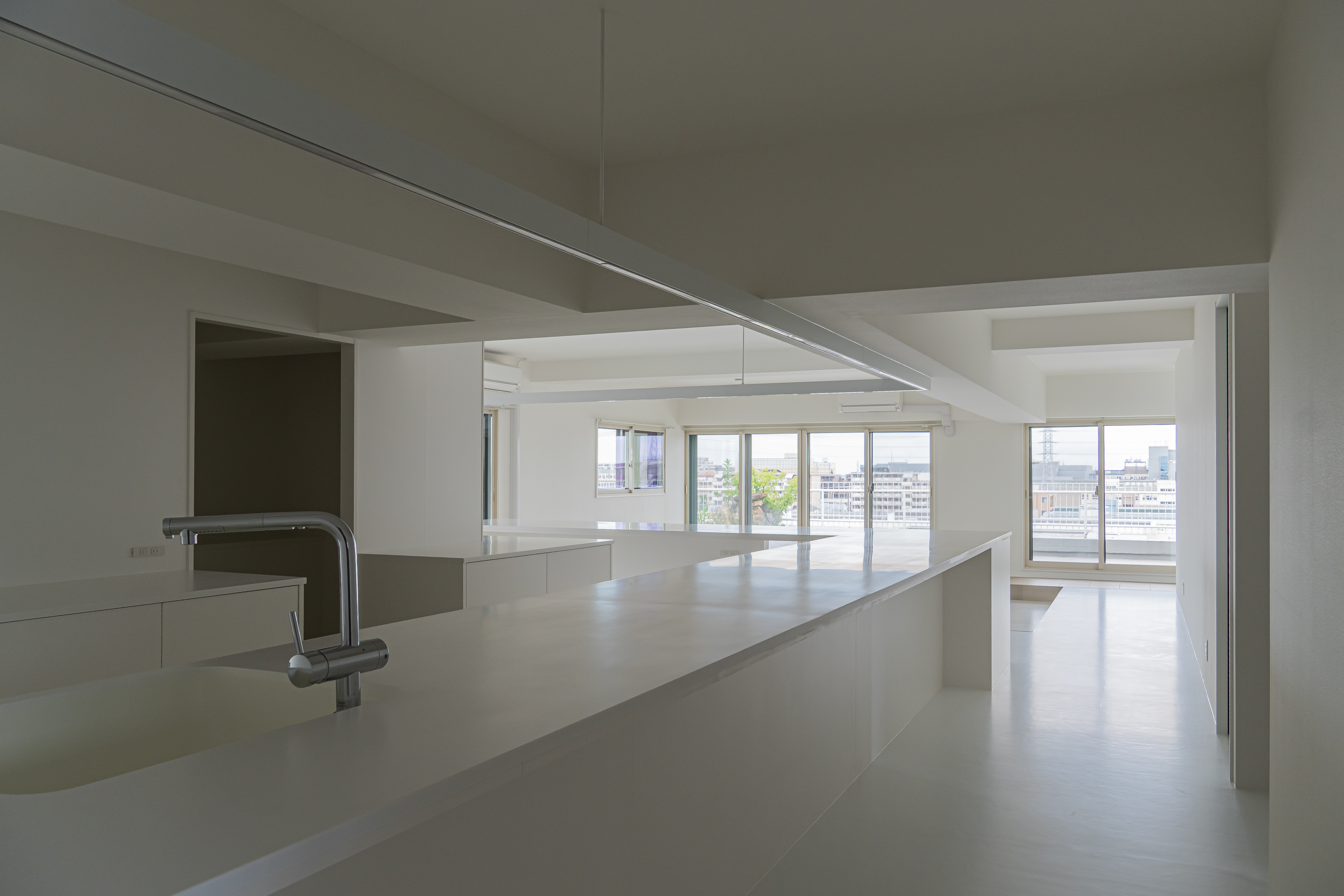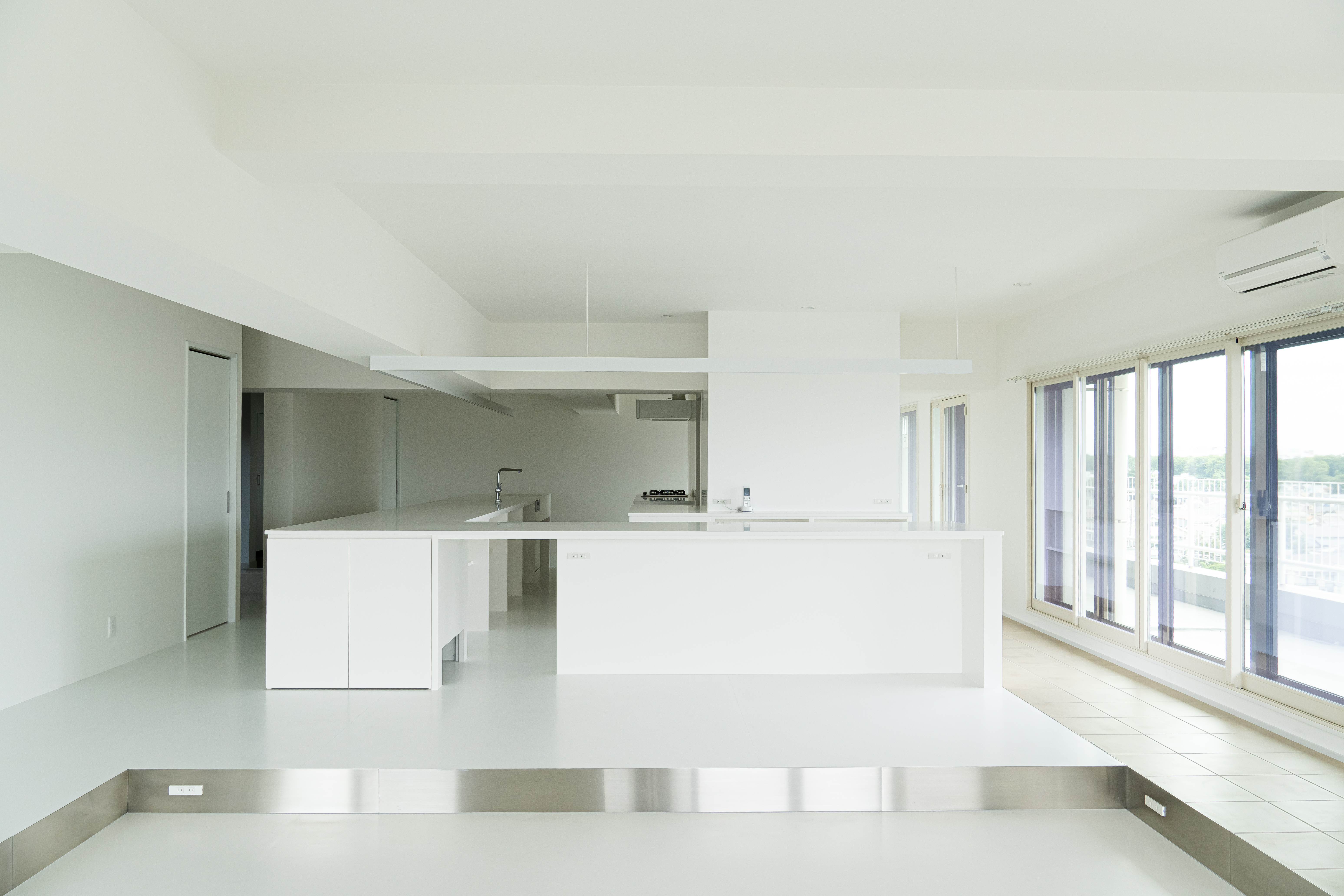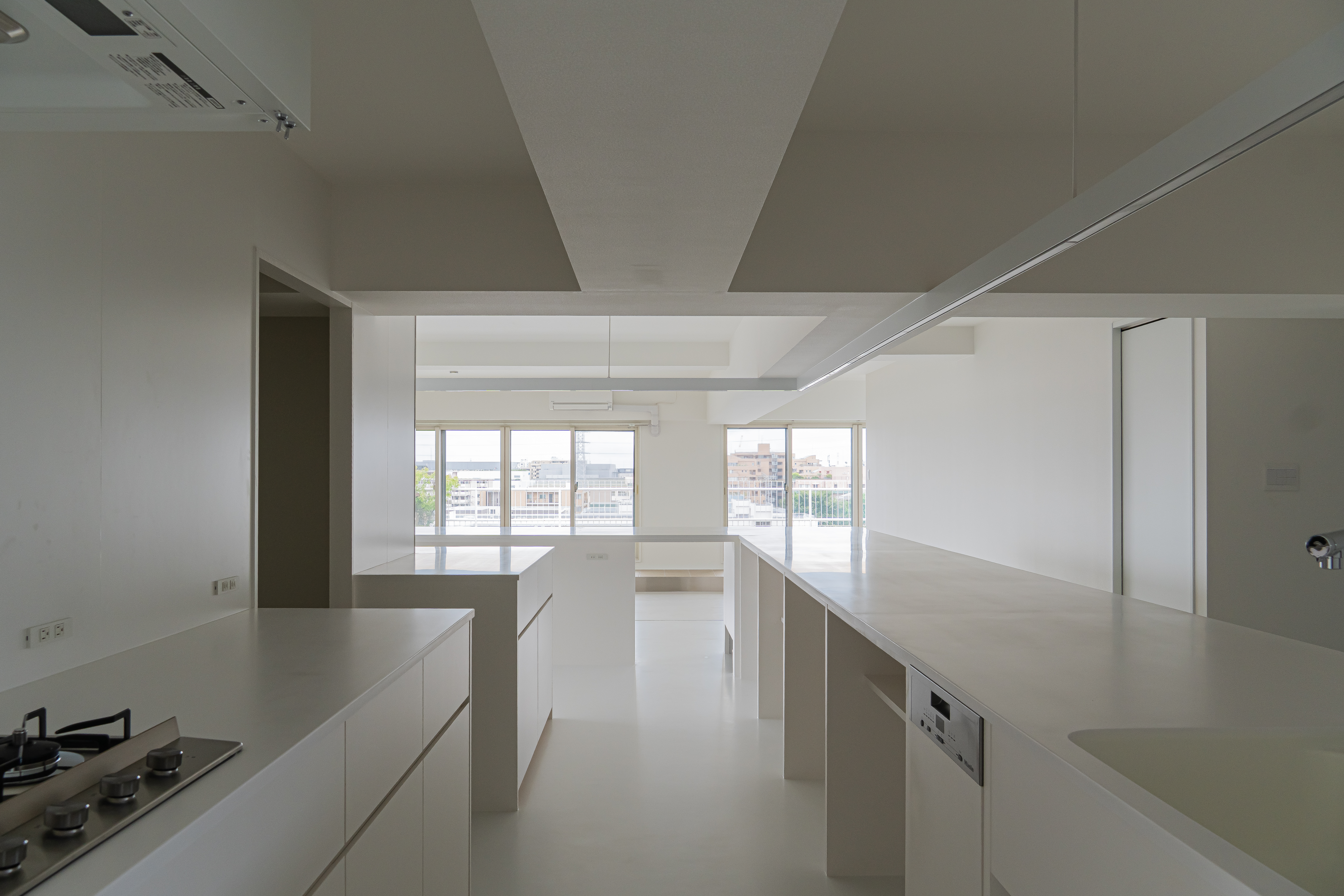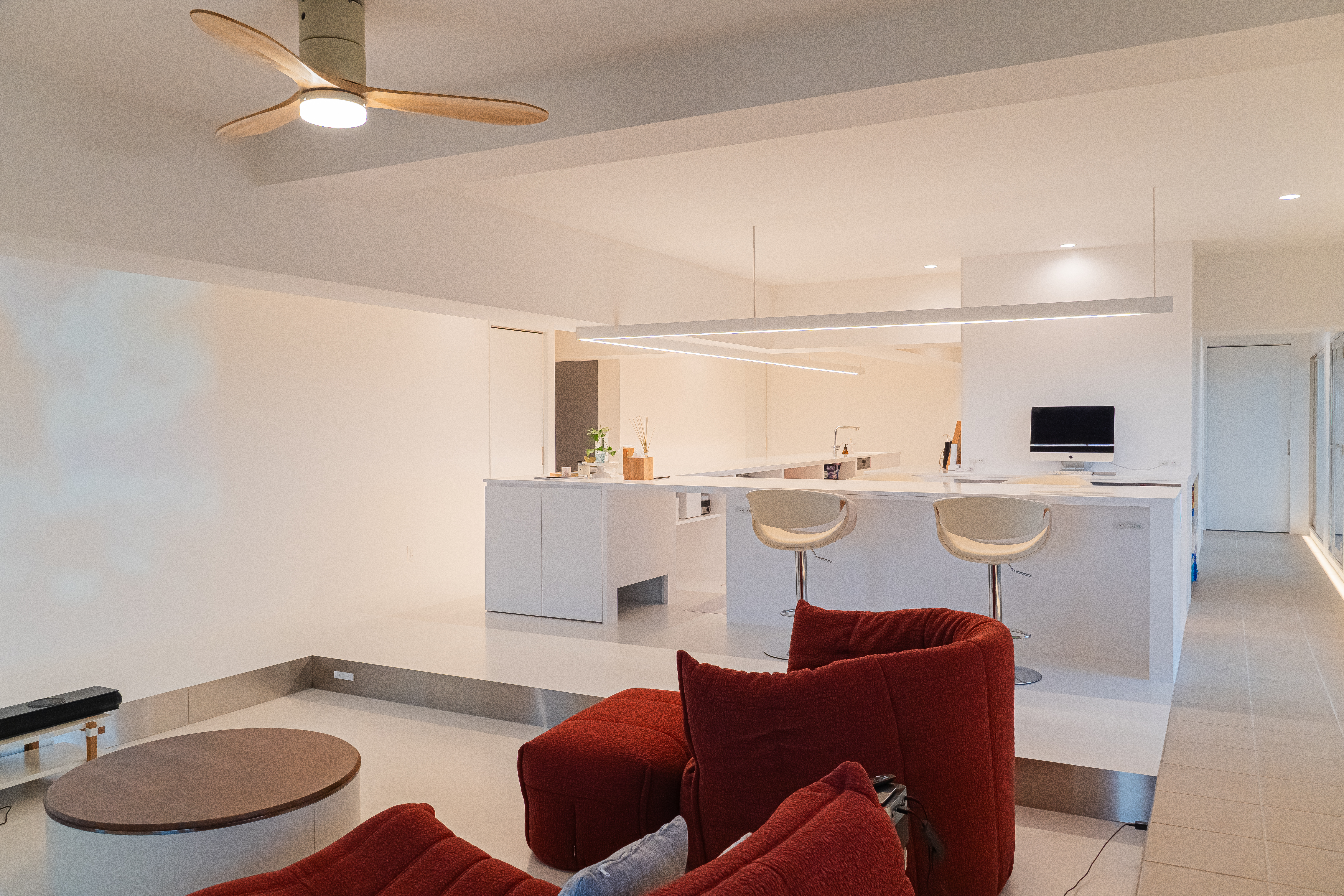 この住まいは、徹底したミニマリズムと洗練されたホワイトが基盤です。LDK全体を白で統一することで、光を最大限に拡散し、無限の広がりと余白の美を追求しました。