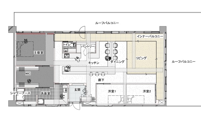 この住まいは、都心の喧騒を忘れさせる静寂に佇む、築年数を経たマンションの一室だ。150平米という広大な空間は、一人の暮らしには十分すぎるほどの贅沢。さらに50平米の広々としたバルコニーを、いかに室内の開放的なアウトドアリビングとして一体化させるかが、このプロジェクトの鍵だった。