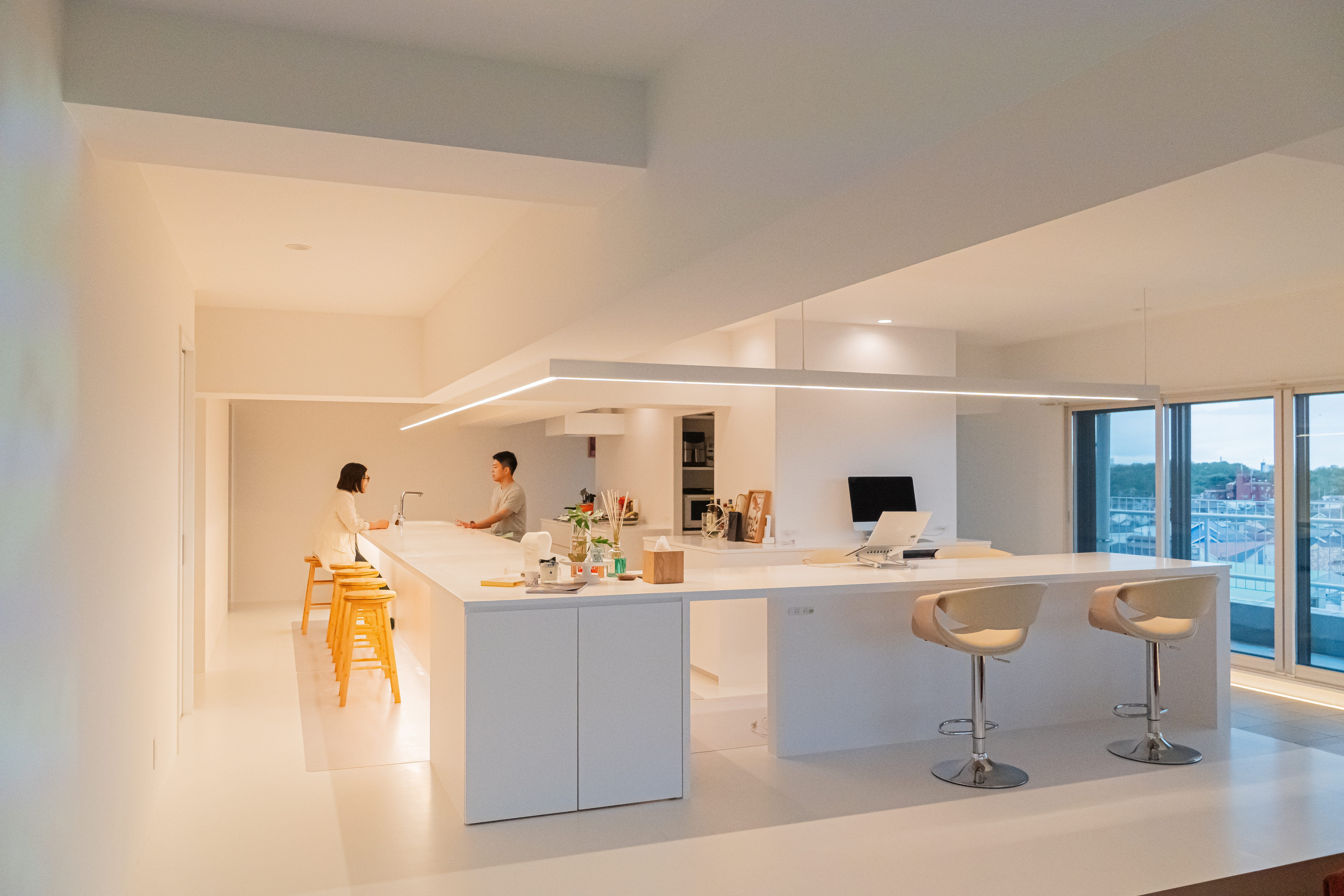 空間の中心には、長さ6mのキッチンと4mのダイニングテーブルを一体化させた、特大のL字型造作カウンターを配置。料理の場であると同時に、家族や友人が集うコミュニケーションの拠点となります。カウンター上には、そのサイズに合わせた特注のライン照明を設置し、夜にはハイエンドな店舗のような洗練された雰囲気を演出します。