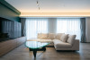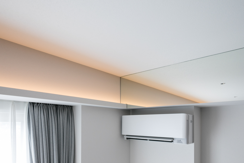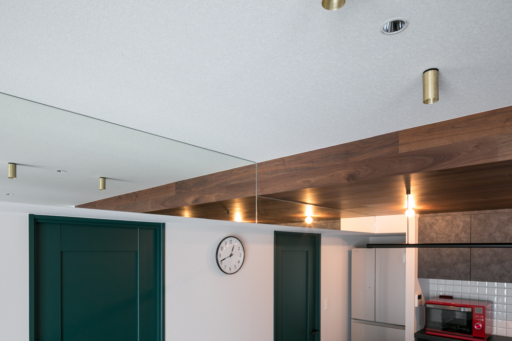 リビングの大きな躯体梁には鏡を施し間接照明の光を映り込ませ、空間に奥行きと広がりをもたらす印象的な演出としました。