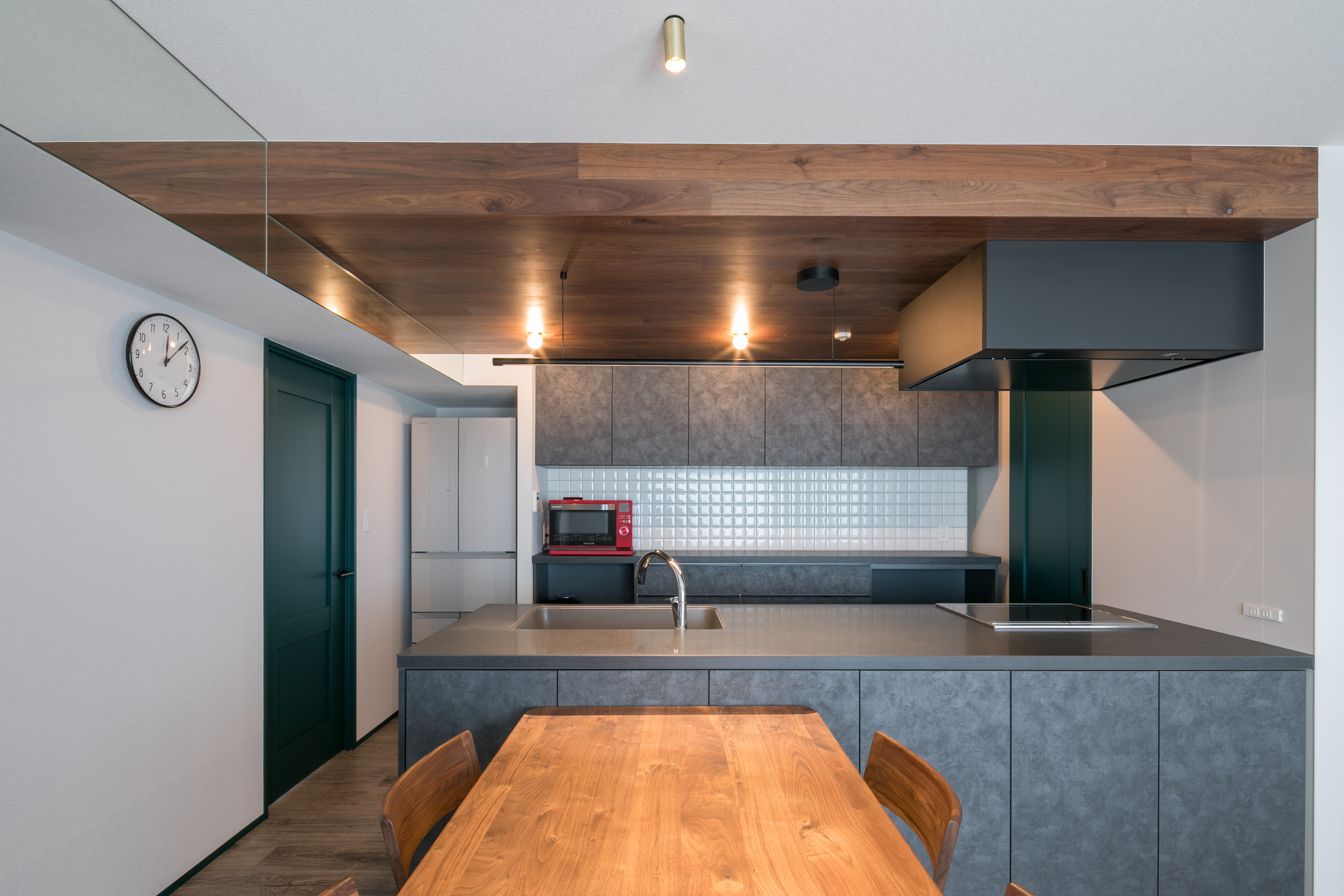 キッチンはリニアペンダントとレセップ照明を組み合わせました。水平に伸びるリニアペンダントと天井面のレセップ電球のあたたかみのある光が空間の心地よいアクセントに。