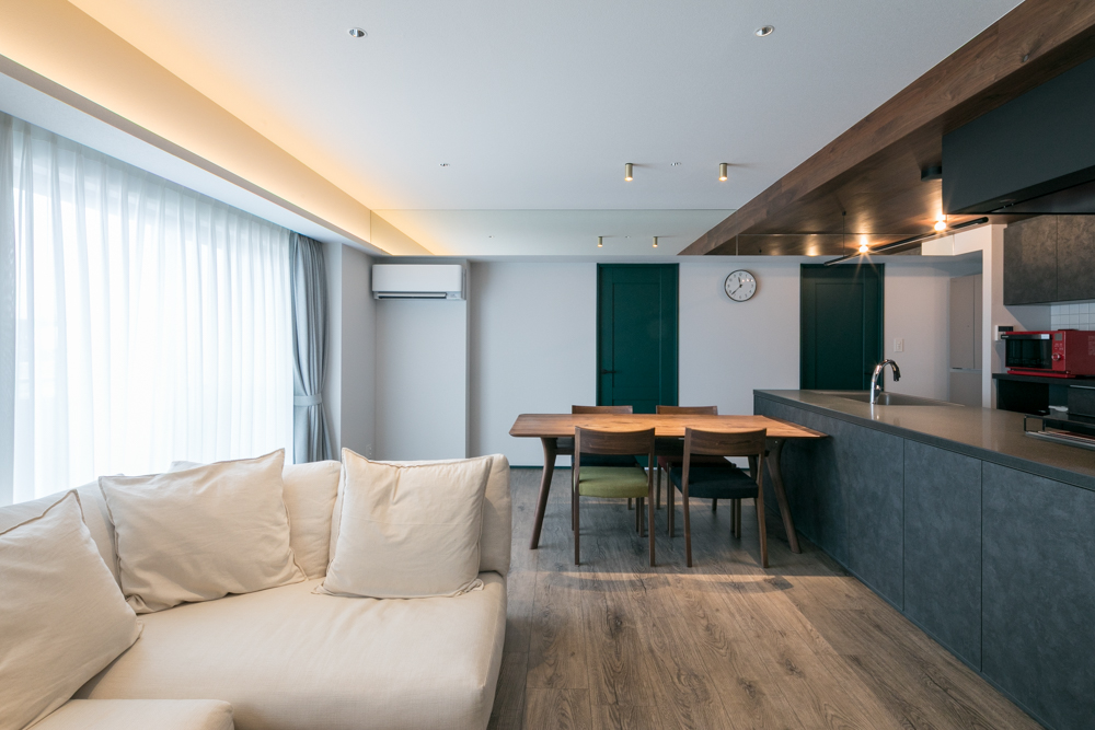 自分たちの思い描く「オープンなキッチンを持つリビング・ダイニングに家族が集まる」暮らしを実現させたいと、住宅のご購入を決意。以前一緒にお仕事をさせていただいたご縁で、物件探しからリノベーション工事まで、ワンストップでご依頼いただきました。ご紹介したのは、都心へのアクセスの良い駅近の中古のマンション。廊下が長く、リビングと居室との関係性がない間取りでしたが、ご要望を叶えられる十分な広さとポテンシャルを持った物件でした。