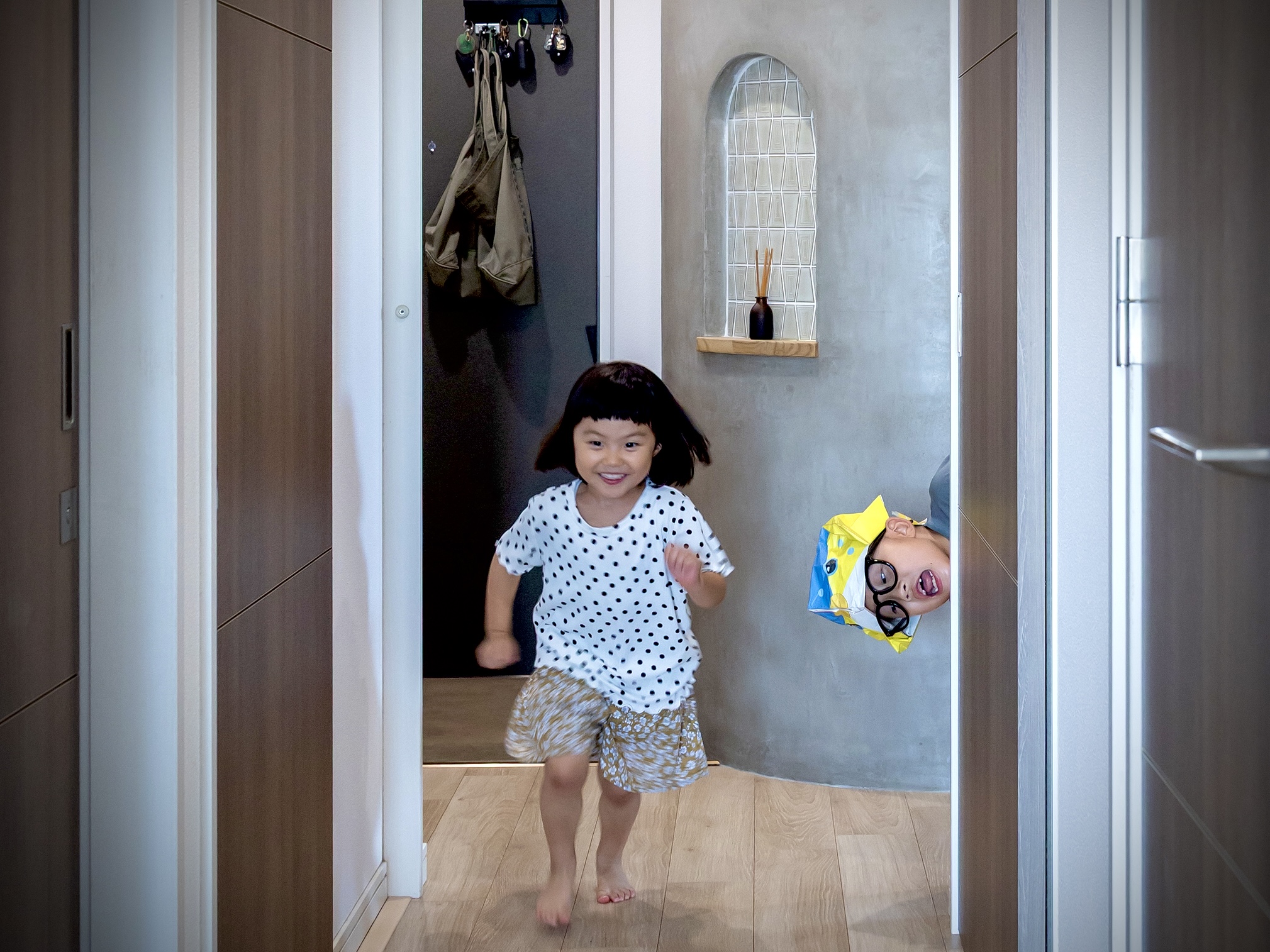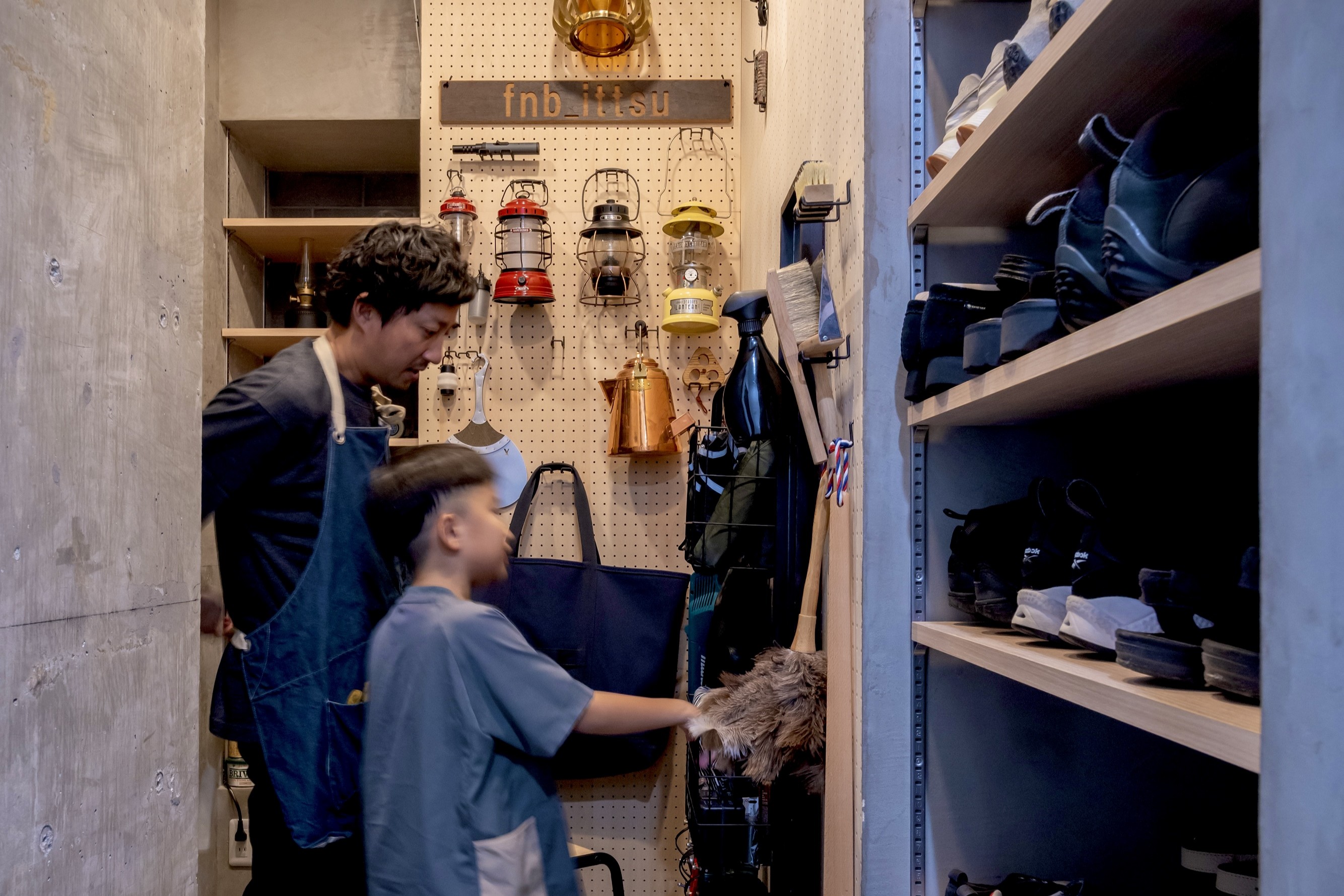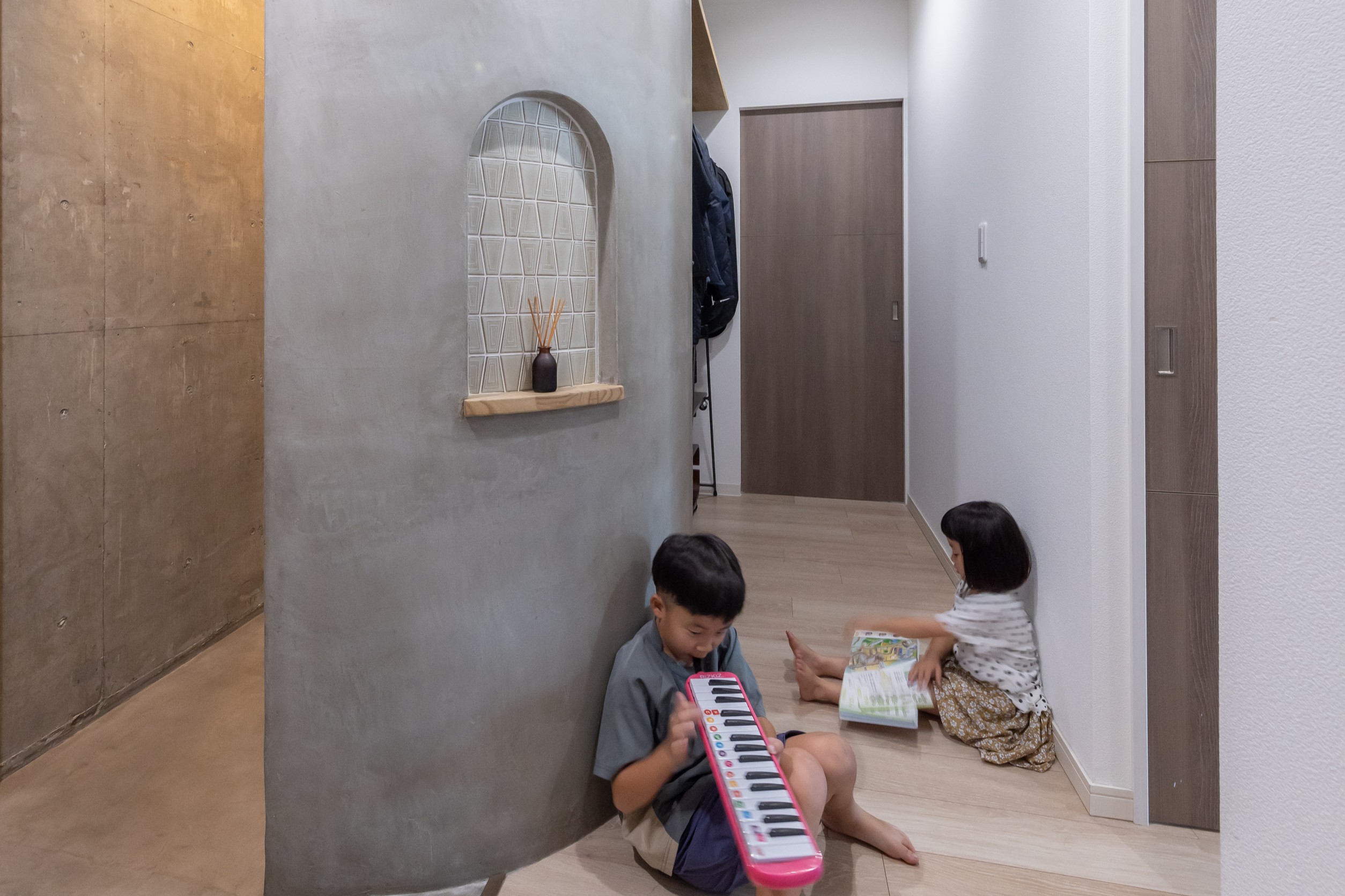 完成したBASEは既存の収納機能も集約した一大交差動線を生み出しました。キャンプギアを手入れするご主人と曲面壁際を走り抜けて集まってくる子供達。談笑する家族の風景は日の落ちたキャンプサイトを思わせます。趣味の空間が生活の一部として機能する事を有効に示してくれた事例となりました。