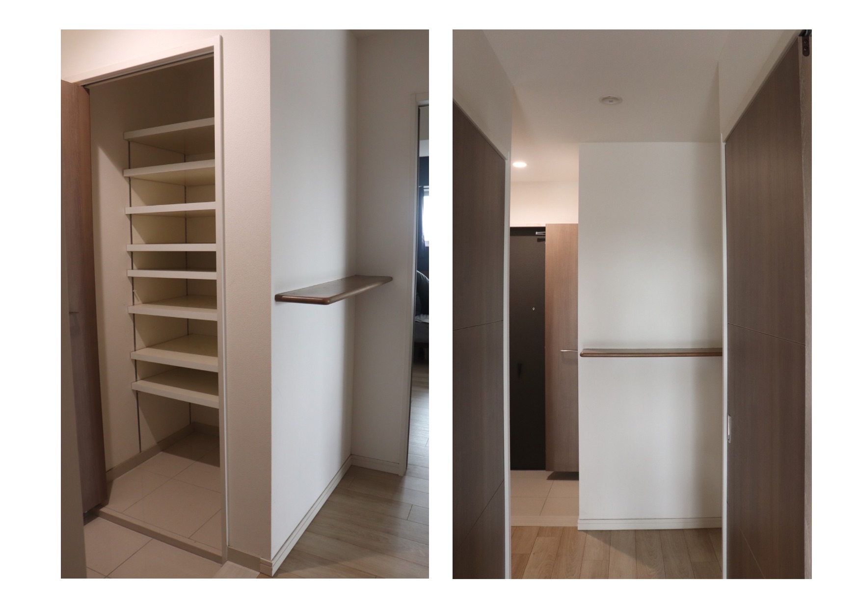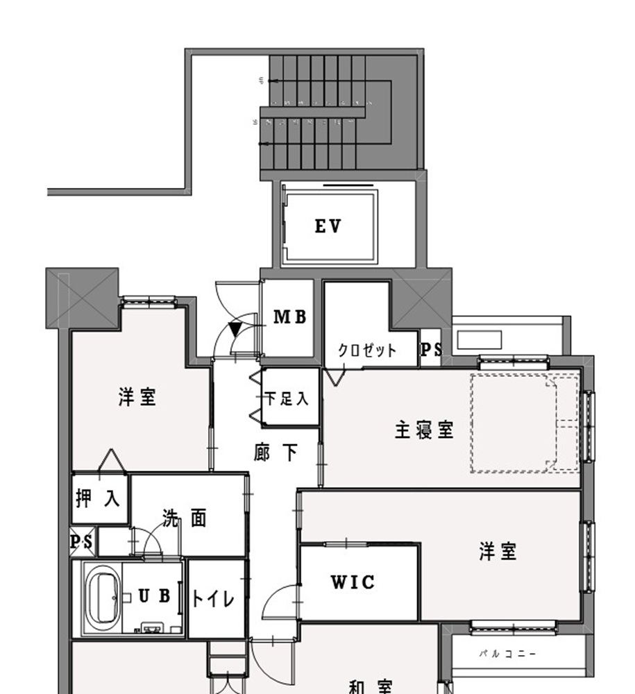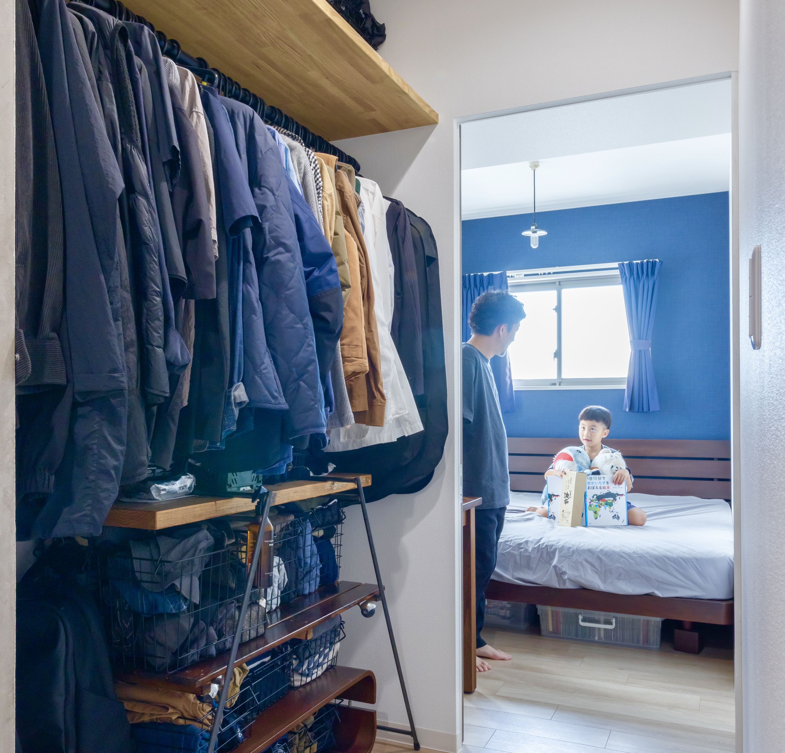 延べ87.53m2に対し既存7.55m2という収納空間の割合はマンションに十分な収納を確保する事が難しい現実を物語っている。面積的な側面だけでは収納問題を解決する事は難しい為、分断された動線をつなぎ合わせる事で機能拡張するというアプローチをとる事になった。最も着目したのは廊下である。既存の収納は居室に接して設けられている事から動線の分断を生む状況にあった。居室から収納を外に押し出す事で廊下に役割を持たせる方針は住居機能を損なわずに改修出来る可能性を示していた。収納面積7.55m2→9.50m2という約2m2の最小空間拡張で居室機能も兼ねる新収納室の実現を目指す事になった。