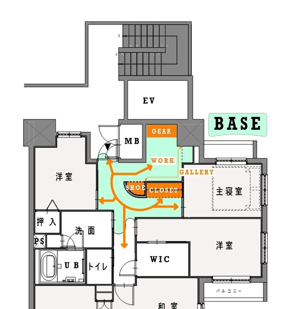 BASEを中心に放射上に広がる動線計画は他の居室との境界を取り払って住居を一体で利用出来る事を意図したものです。収納という生活動線が交差する部分だからこそ実現可能な家族の交流空間をモジュール(規則性)のない手法で有機的に描いていきます。