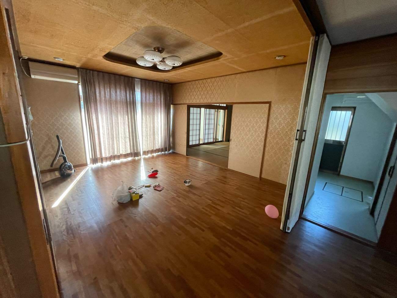 庭付きで、1・2階合わせて十分な広さがある築42年の住宅。庭からは田園風景を望め、閑静な環境ながら駅にも近いという立地で、店舗兼住宅を希望されていた施主様の理想にぴったりでした。室内はレトロな柄のクッションフロアやアコーディオンカーテン、床の間や押し入れなど、昭和らしい趣のある造り。備え付け家具のように活かせる部分は残しつつ、予算内でのリノベーションを目指しました。