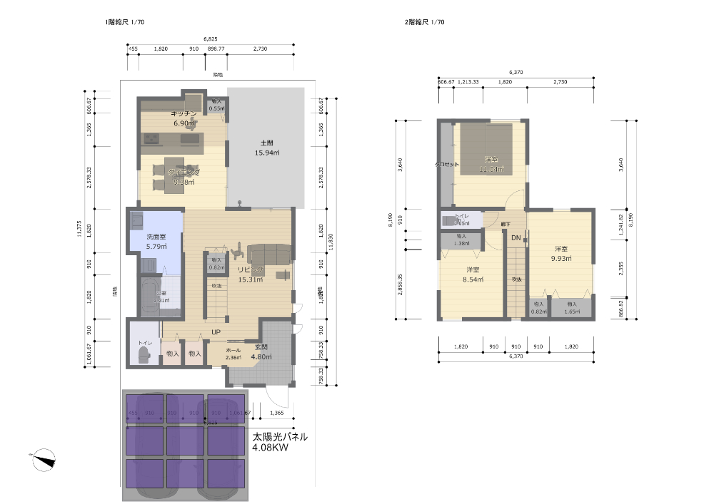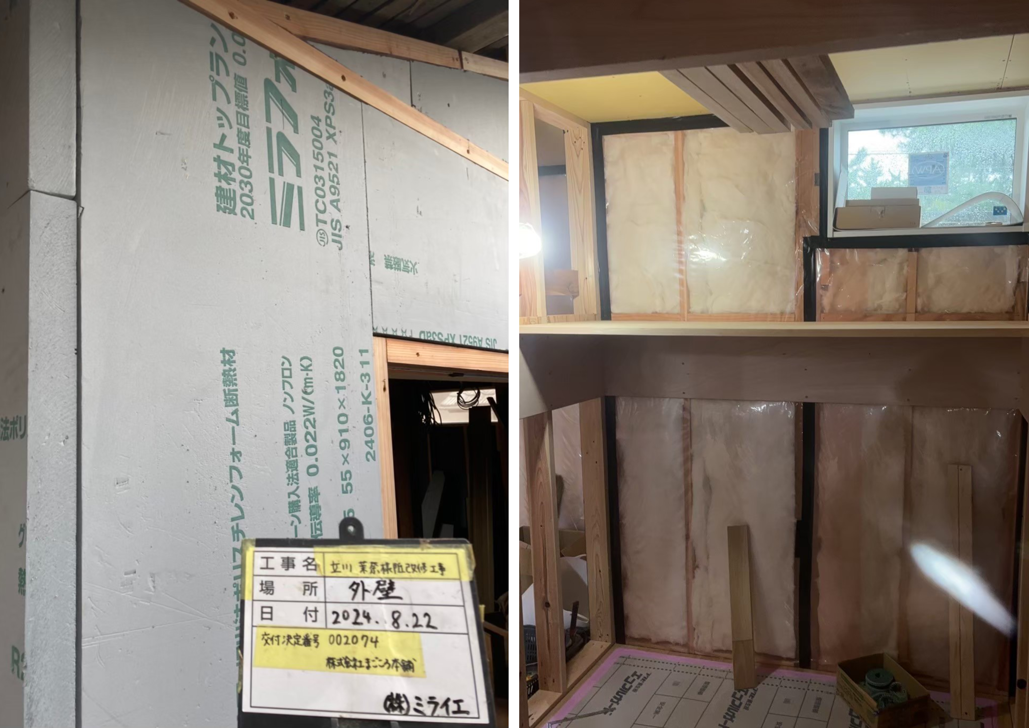 今回のリノベーションでは付加断熱も行いUa値0.32(断熱等級6)C値は0.36と太陽光パネルをカーポートに施工し、