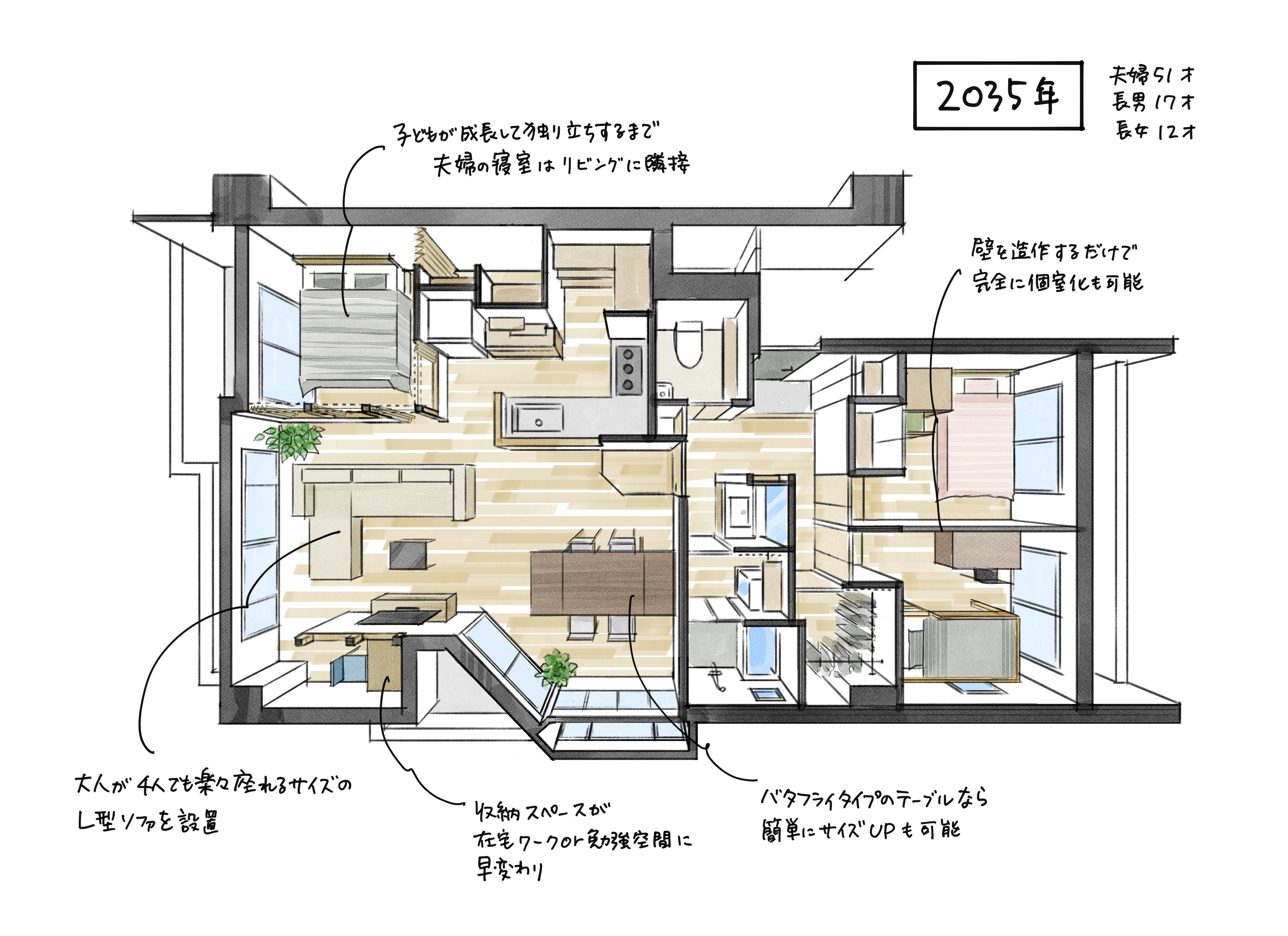 子育てに応じて、必要な個室数は変化する。だからこそ「タテ、ヨコ、高さ」という従来の3D設計ではなく、そこに「時間軸」を含めた4D設計が重要となってくる。現在の最適な暮らしはもちろん、将来もワクワクする暮らしを維持できるよう、プランニング時点から未来を見据えた設計及び家具選定をインテリアショップ「アクタス」の協力を得て行った。子育て初期には1LDKとして、子どもの成長に合わせて2LDK、3LDKとして使用できる設計となっている。