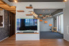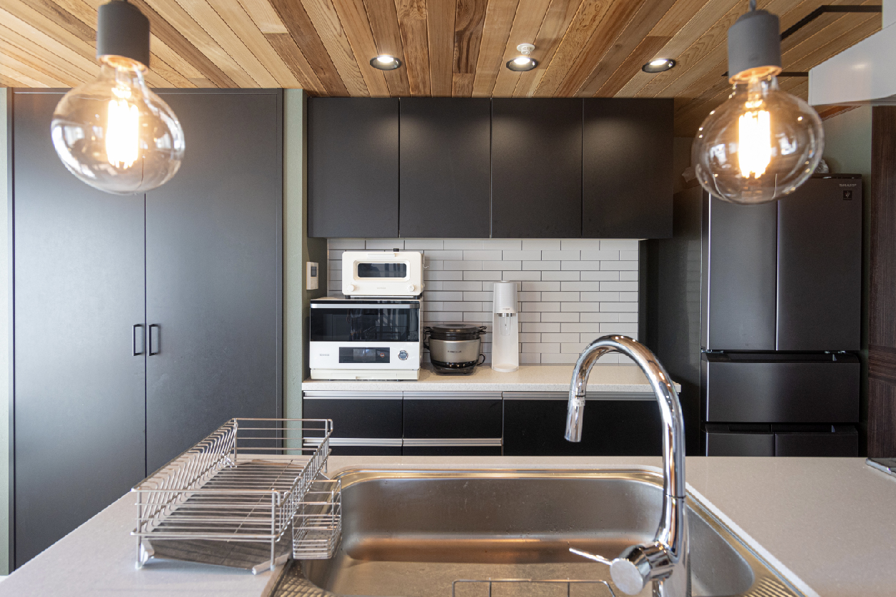 「キッチンはカフェのような雰囲気に」という想いから、木とタイルを組み合わせ、黒の照明や建具で空間を引き締めた。