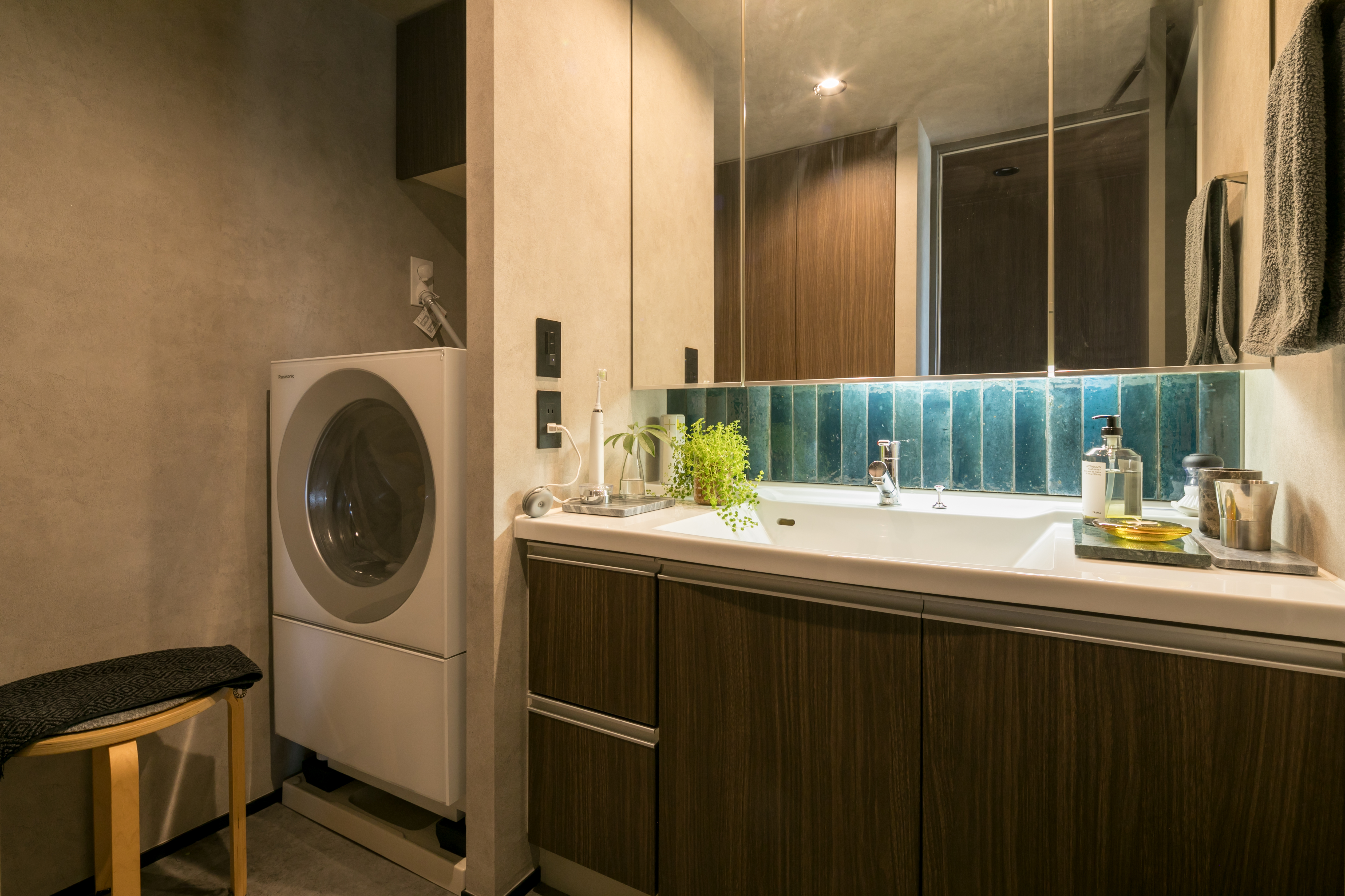 洗面台上のタイルはキッチンと同じものを採用。ご主人がDIYで仕上げました。