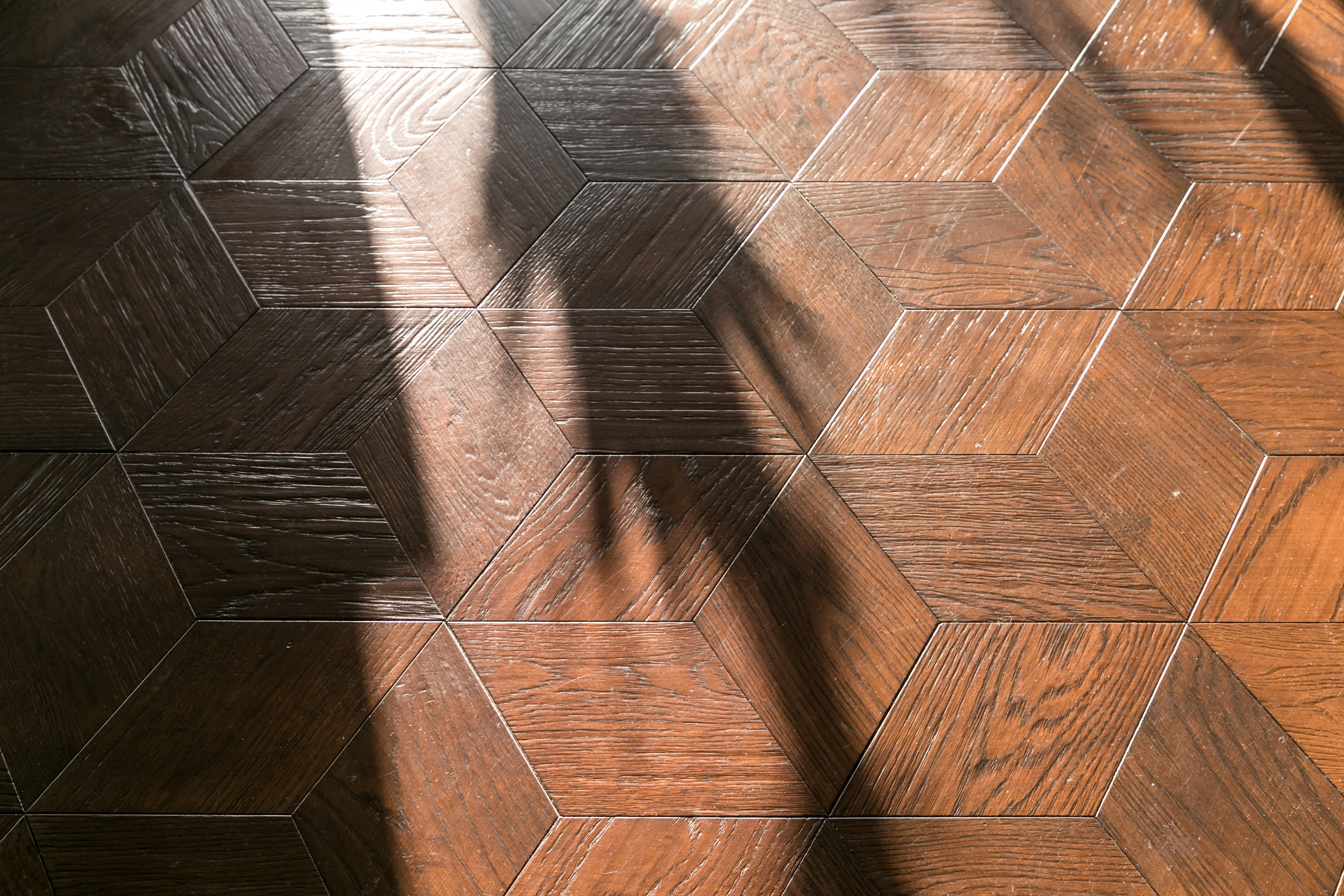 床材は六角形のフローリングを採用し、壁はグレーのクロスを基調に木のリブパネル、水墨のジョリパット、キッチン前にはブルーグリーンのタイルでアクセントを加えました。天井面はホワイトのクロスを採用し、スポットライトやレールで洗練された空間に仕上げました。