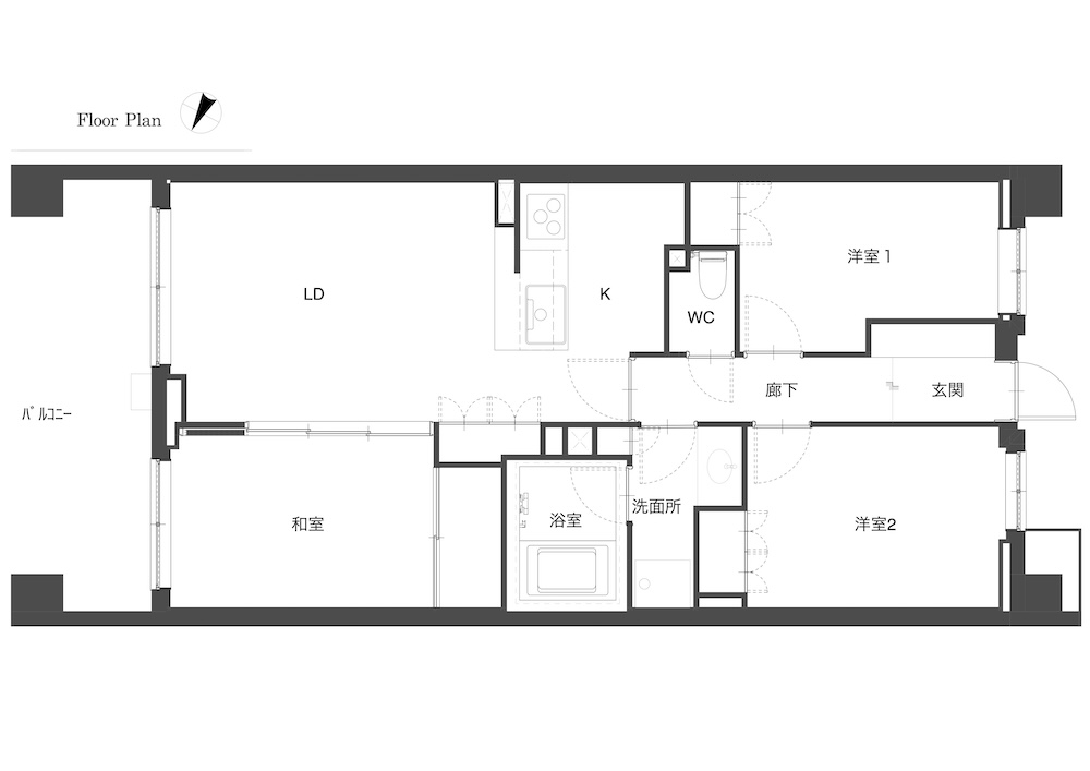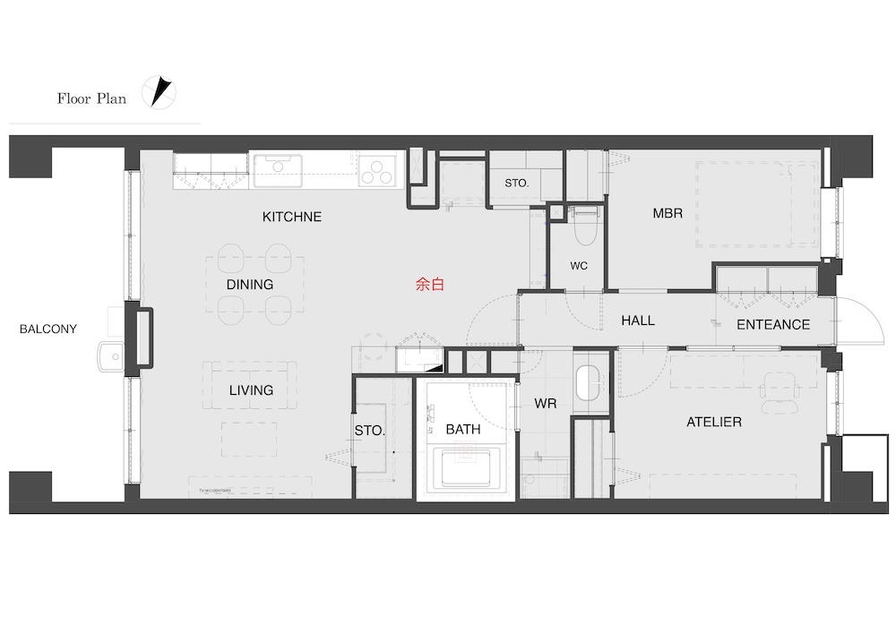 既存住戸は、新百合ヶ丘に建つ築10年ほどの分譲マンションの一室である。耐震等級2を有し、建物自体の安全性と耐久性は高く、長期的に安心して暮らすことができる。解体の過程においても躯体の健全性が確認され、その堅牢さが改めて信頼感を与えていた。さらに、地面に面した大きなバルコニーを備え、周囲には緑豊かな環境が広がっており、新百合ヶ丘らしい落ち着いた住環境を享受できる点も特筆される。間取りや設備も健全で、分譲マンションらしい安定感を備えていた。一方で、その均整の取れた構成は安心感をもたらす反面、住まい手の感性や世界観を映し込む余白は限られていた。本計画では、この信頼性の高い基盤を尊重しながら刷新を行うことを目指した。