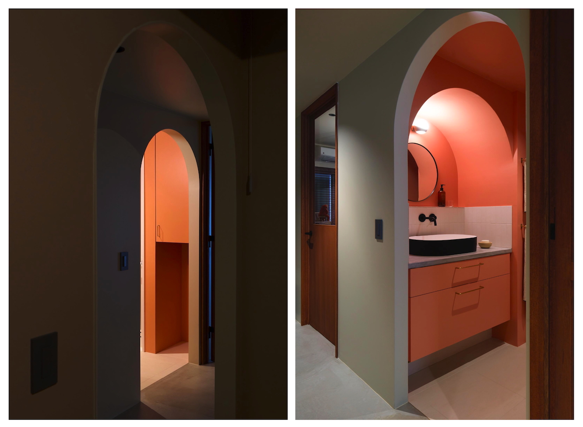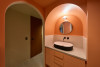 床は水彩の下塗りのようにムラを残すモルタル仕上げとし、輪郭は角を落としRを施すことで、滲むような柔らかさを体現した。色調は真っ白ではなく、くすみを帯びたベージュがかった緑。光や時間の移ろいに応じて淡く変化し、日常にやさしい物語性を与える。