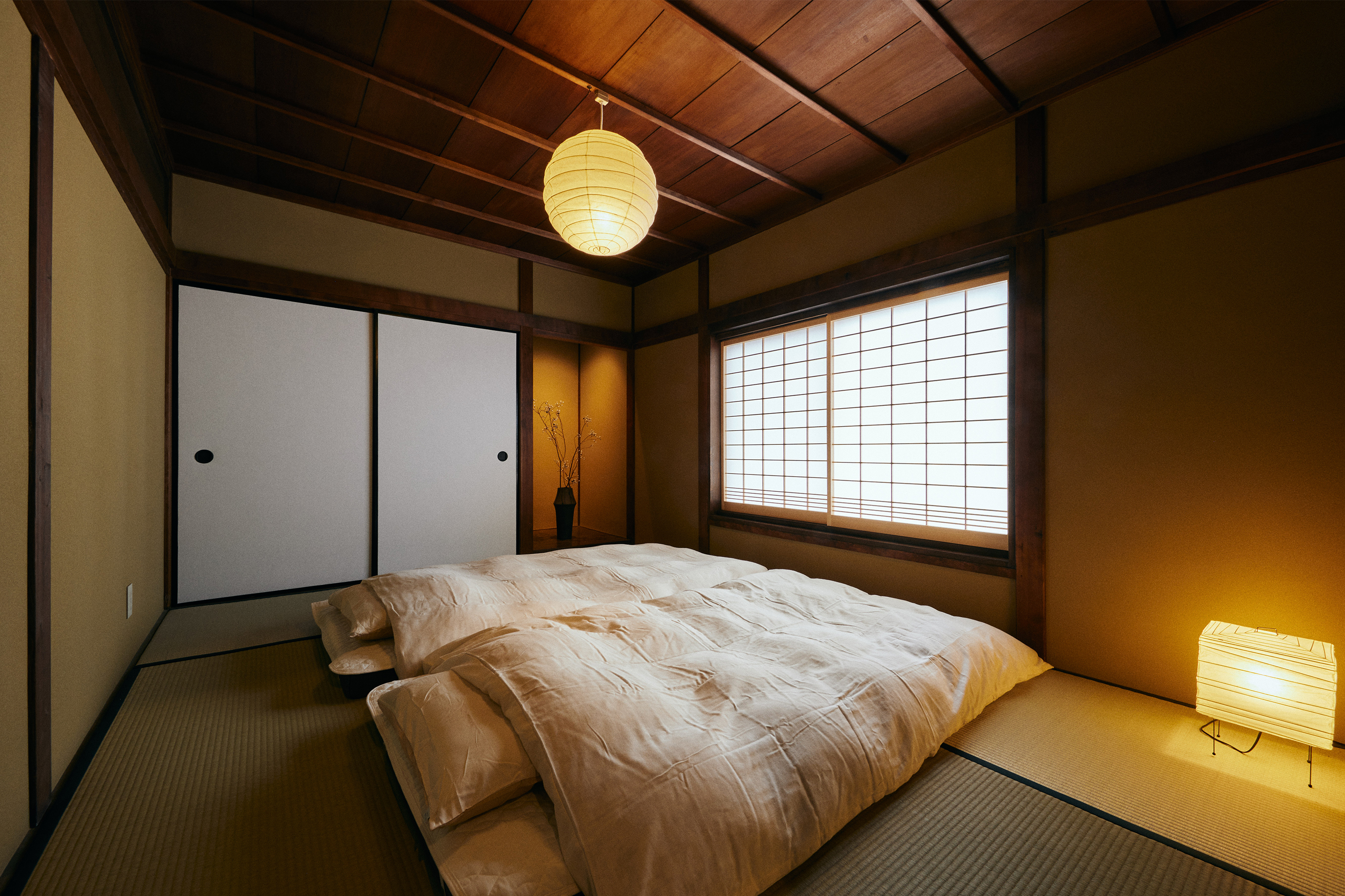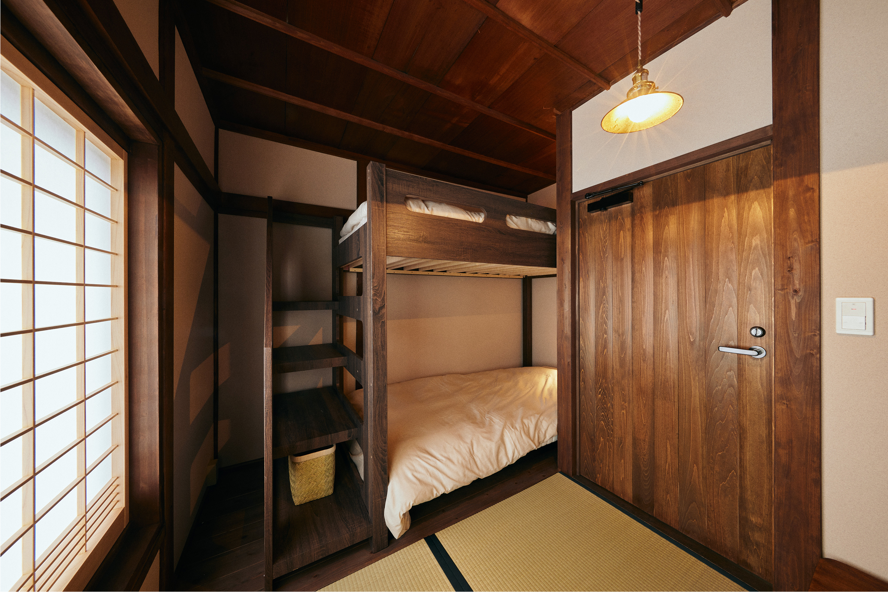2階は襖で仕切られた続き間を欄間を残しつつ真壁風の壁で区画(和・灯)。二段ベッドがある(波)は一部壁を立てて客室動線を確保。ただし付加した壁は、撤去して襖を立てれば元に戻せるように設置して、歴史的価値の保存に配慮しています。断熱補強は、天井と床に断熱材を敷設。既存建具は、外側に複層ガラス建具を付加したり、室内側に障子を追加したりして建具の複層化による熱環境向上を実施。真壁造の壁は、既存意匠保存のため断熱を見送りましたが、隙間塞ぎ等の気密性UPを施しました。耐震は当初評点1.0を目指していましたが、隣接建物(別所有者)と構造を共有していることが工事中に発覚。一部を固めすぎると、強い引抜き力が躯体にかかり危険性が増すため、金物補強を中心に適度な壁倍率の耐力壁を分散設置して評点0.7程度に留めました。