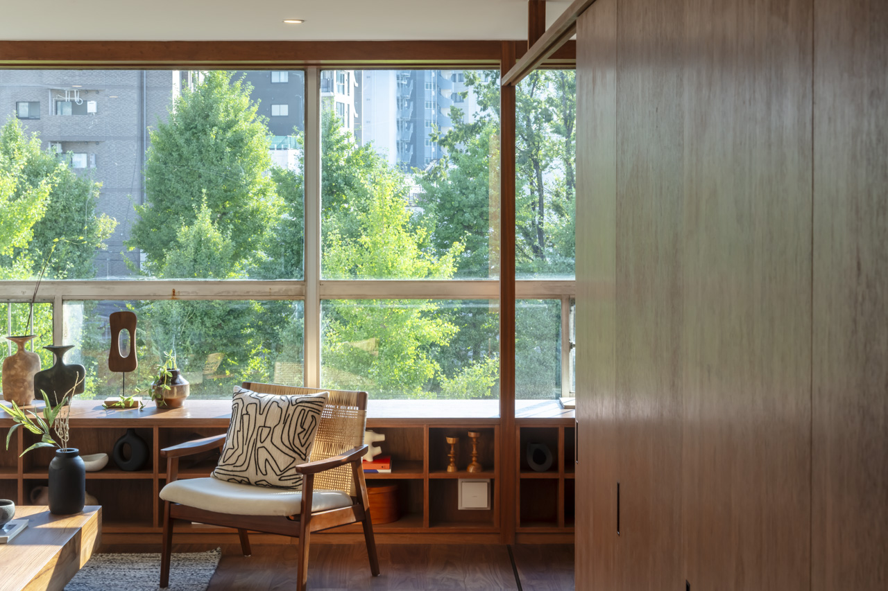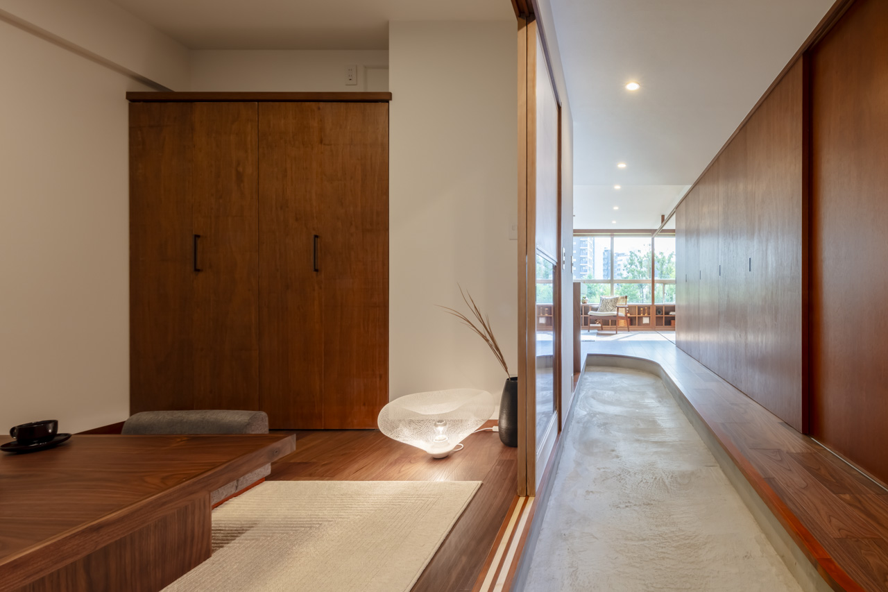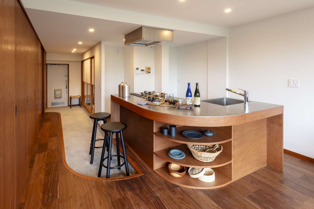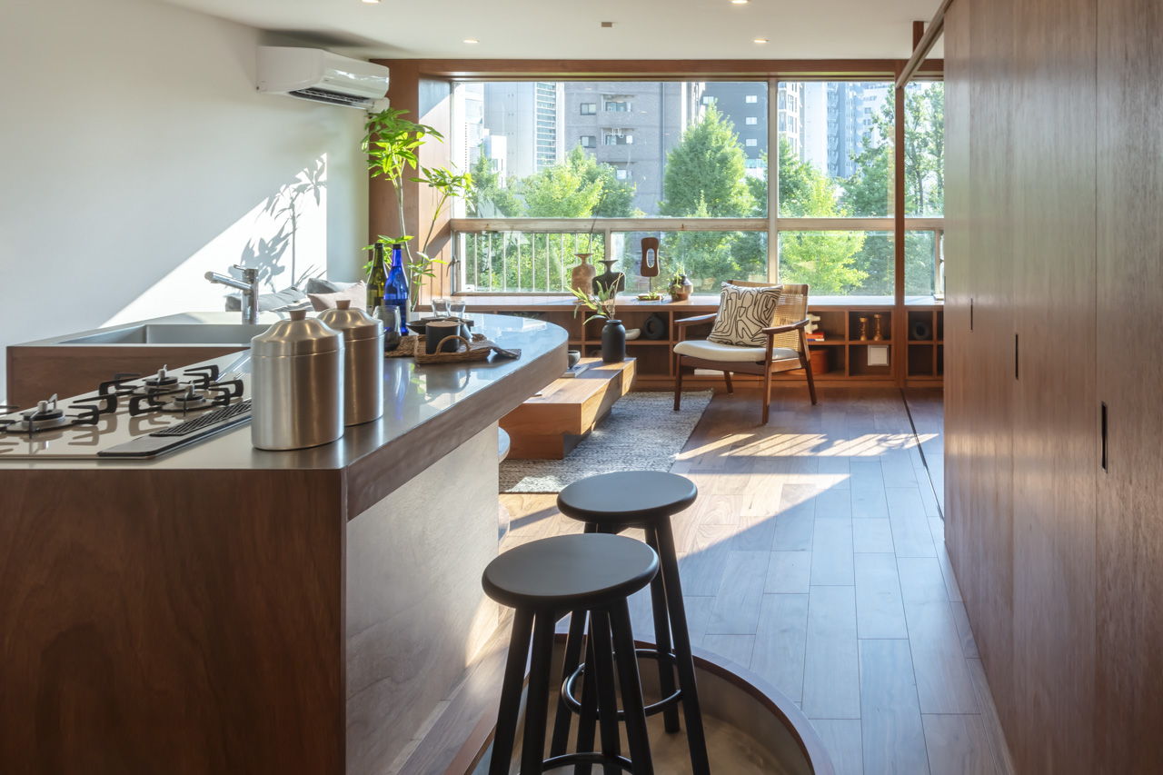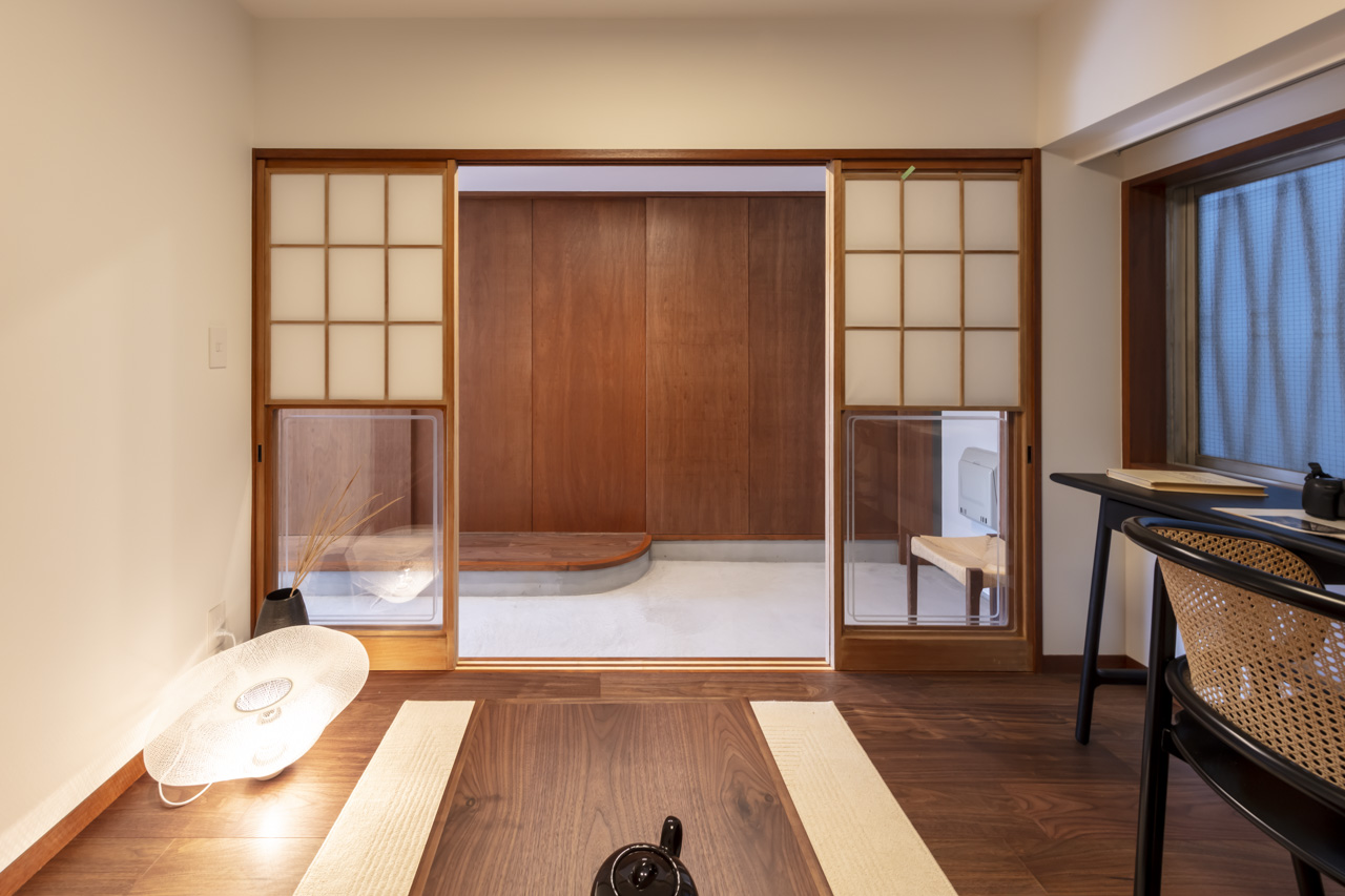 大きな窓越しに見える旧岩崎邸庭園の緑に触手を伸ばすように土間をキッチンまで伸ばし、下足のままでも人を迎え入れられるようにした。玄関入ってすぐの横には、古材の雪見障子を設え、客間としても、書斎としても使える離れのような空間。ひとりの時間も、誰かとの時間も、心地よく交差する場所をつくった。