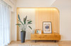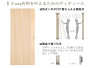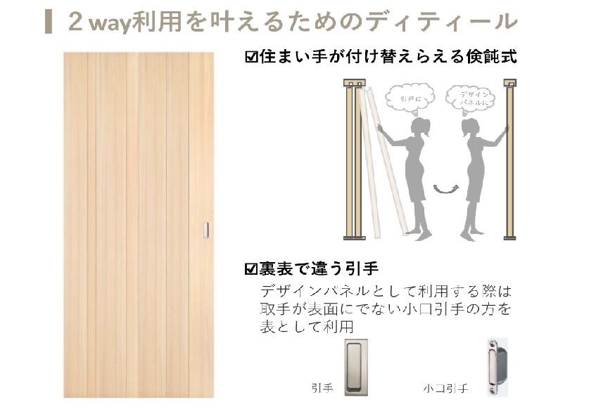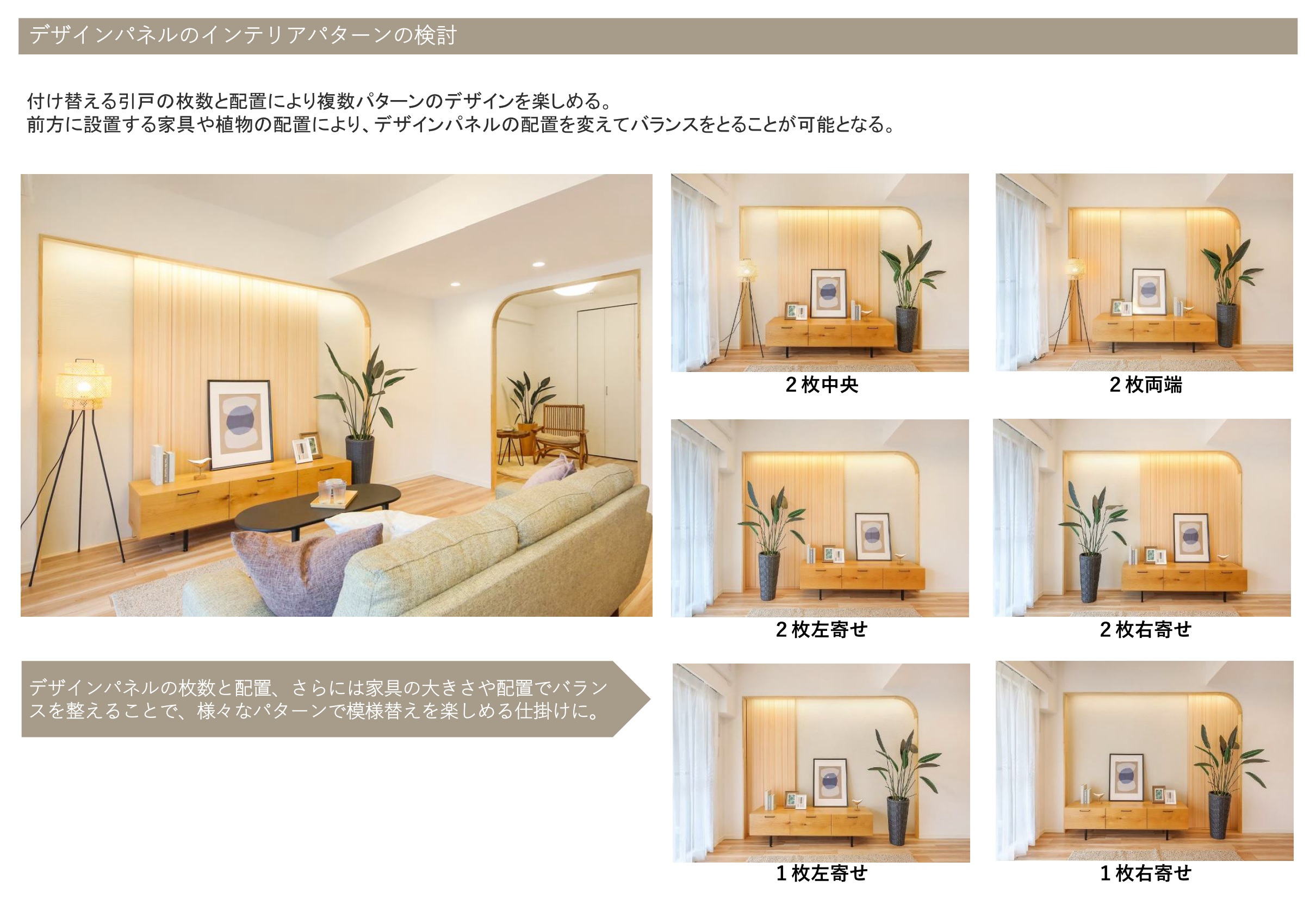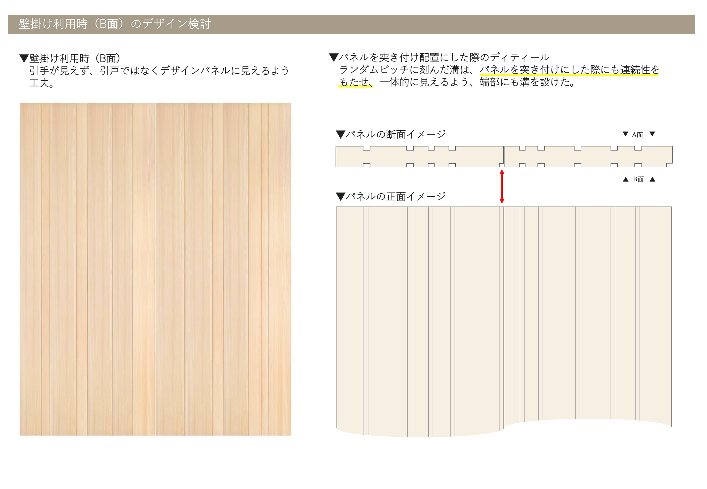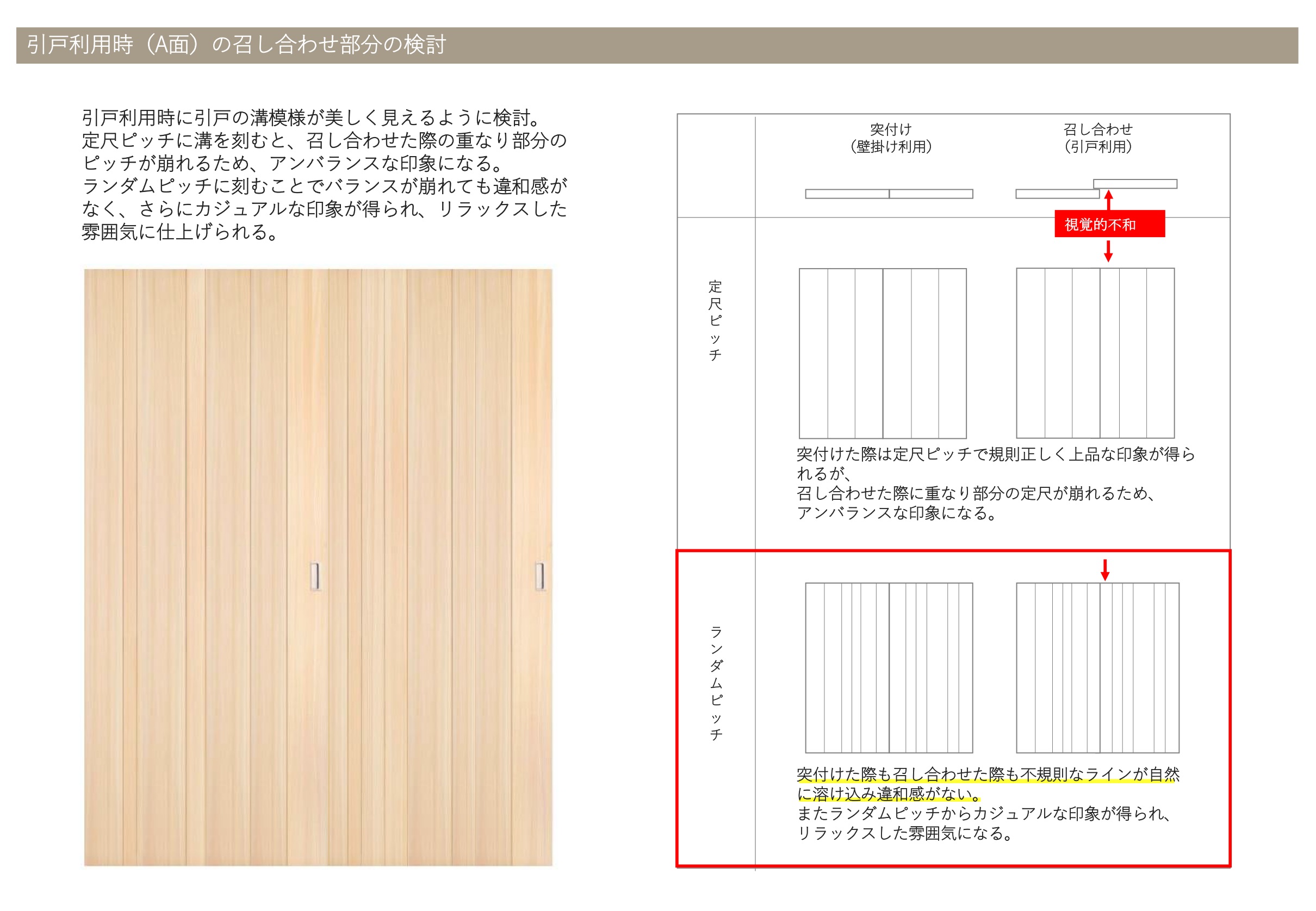 家族に寄り添って共に変化し、一緒に時を刻んでいく。そんな「住まいのシンボルがあったら良いな」という発想から、凛とした姿が美しい国産材の引戸を主役にしました。 桧を使った引戸製作でのこだわりは、見た目の美しさはもちろんモダンなインテリアにもしっかりと溶け込むよう建具面材にランダムピッチの溝を刻むことでリズム感のある表情を持たせています。引戸枠には部分的にアールを取り入れカジュアルに仕上げました。この引戸の最大のこだわりは「ランダムピッチの溝」による建具デザインです。これにより引戸を「召し合わせた際」「壁掛けにして突付けにした際」など、使用方法によって異なる配置なっても美しい一体感が生まれます。壁掛けとして使用する際は「1枚で使う」「2枚で使う」「寄せて使う」「離して使う」など様々な使い方が可能です。ライフスタイルに応じて柔軟にレイアウトを変えて好みのインテリアを楽しめます。木製建具は時が経つにつれてその味わいが増します。桧の引戸もその豊かな質感とデザイン性により、時とともに愛着が湧いてきます。桧の引戸を主役にしたリノベーションは、住む人に寄り添い、変化を共に楽しみたいという思から生まれた買取再販リノベーションです。日本の環境や林業を守る為の国産材の活用と共に、季節に合わせて暮らせるよう工夫してきた日本の伝統的な建築手法を守る意味でも、この引戸提案が広がっていくことを願います。