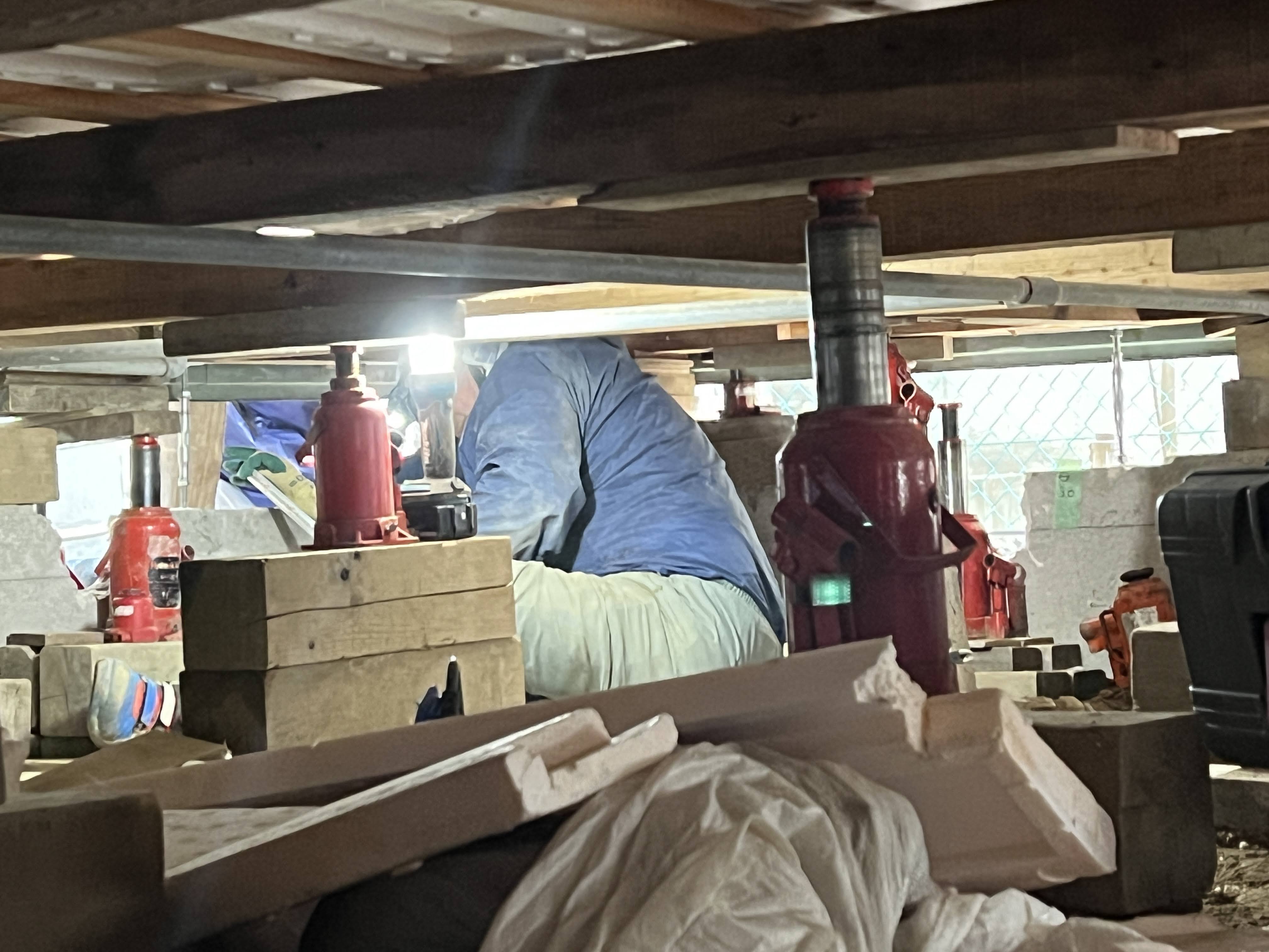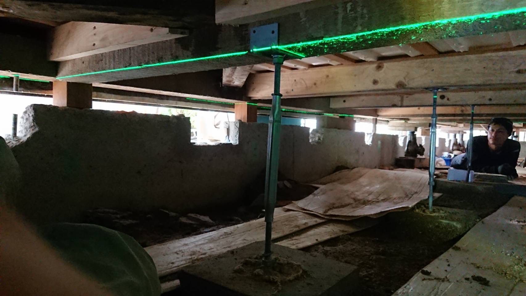 ジャッキアップの経験がある当社として、何とか復元に努めたいと思ったが、本件27/1000ほども傾きがあると、基礎から土台が31㎝も上がり基礎補修のノウハウもなかったため、プロの曳家とタッグを組んで進めていくものとした。
