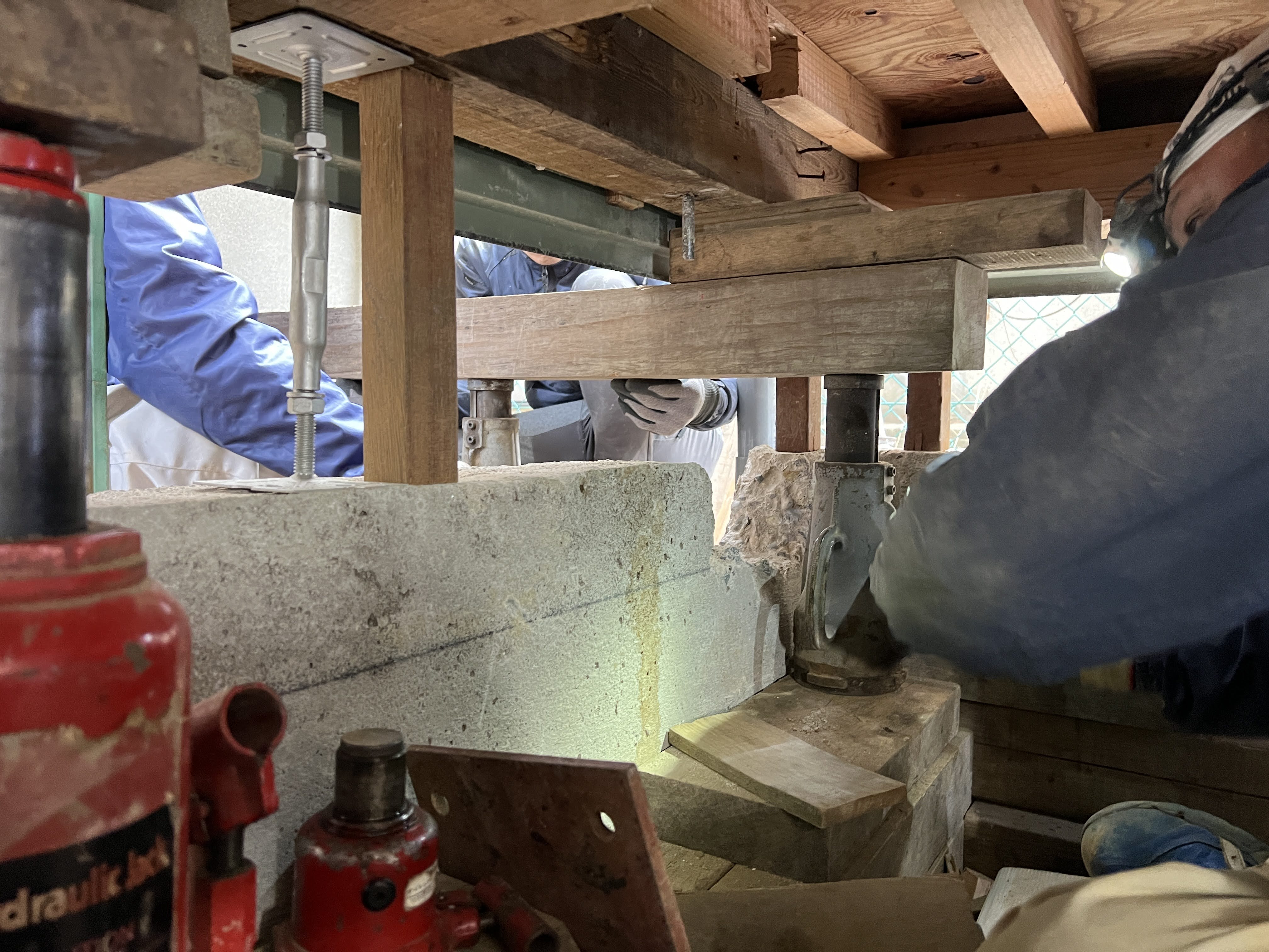 ジャッキの数、揚げ方、施工中に万が一地震があった際のバックアップ、揚げた後の受け木材の使い方、モルタルの詰め方等、非常に多くのことを学ばせていただいた。