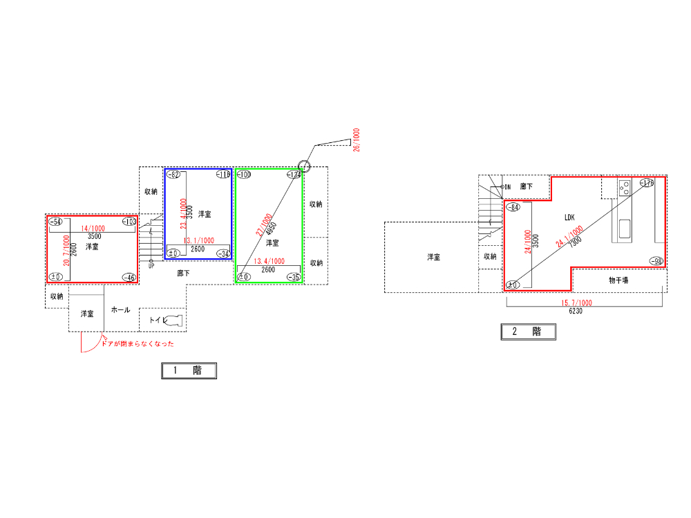 初期調査で確認できたのは、傾き27/1000、最大沈下量310㎜、屋内の壁面の破損