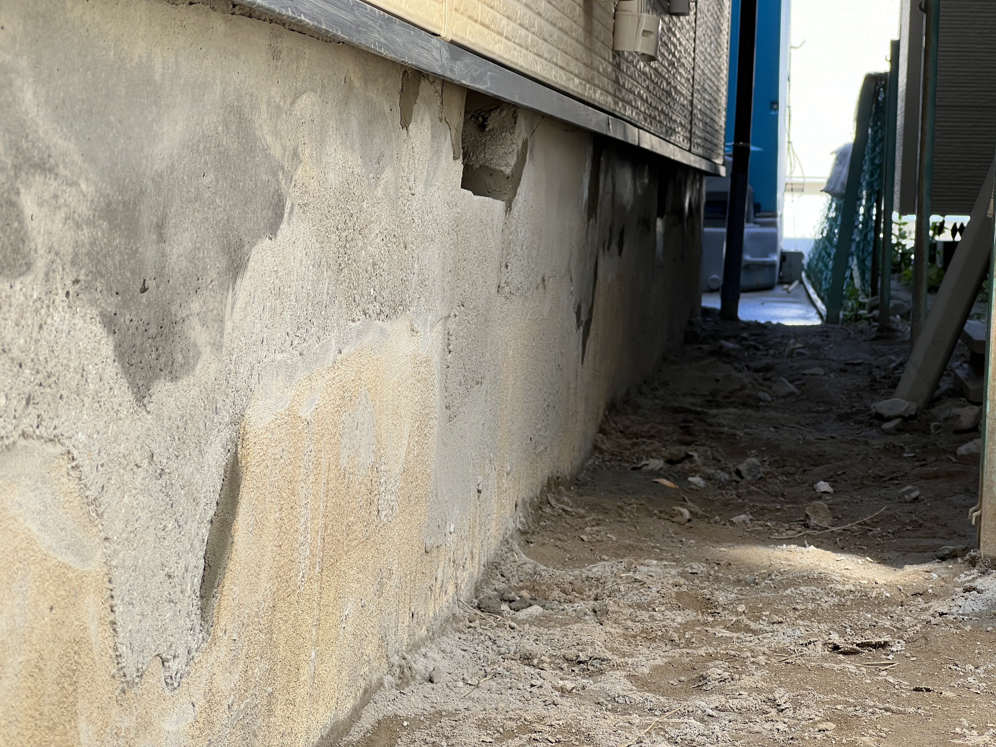 当該物件は2017年に当社にて買取再販を行った住宅であり、地震被害の報告を受け駆け付けたときは、道路から10㎝以上も下がり土砂があふれていた。