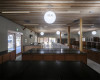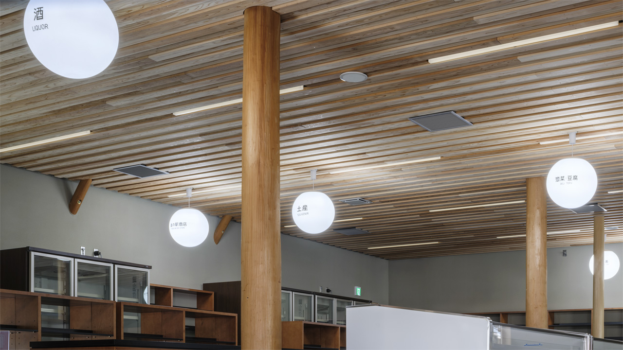 この新たな役割を象徴するのが「土着」をテーマとした建築デザインだ。天井には地産の杉材ルーバーが広がり、杉の伸びやかさと力強さで空間を演出。最大の課題であった西日対策として、ファサードには自然石を積層した日除けルーバーを新設した。強烈な直射光を遮りつつ、木漏れ日のような柔らかな光を内部に届けるこの重厚な石のフィルターは、厳しい自然環境と共生してきたこの土地の記憶と、未来へ向かう村の揺るぎない意志を体現している。