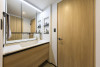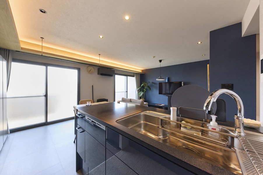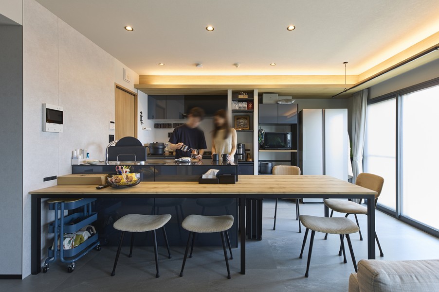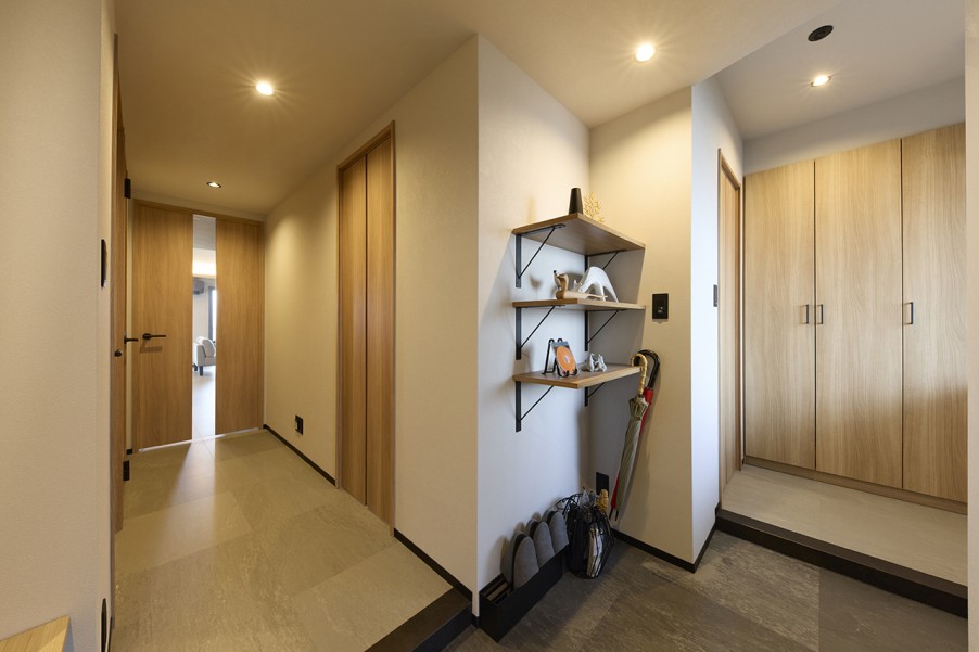 「自分たちらしい暮らしを描けるリノベーションのほうが合っている」。そう語るのは賃貸マンションにお住まいだったYさまご夫妻。結婚式と新婚旅行を終えたタイミングで、住まいの購入を検討し始めました。SNSで評判の良いものでも、本当に自分たちのライフスタイルに合うのかどうかを、一度立ち止まって考える。そのような思いの中、ご夫妻がリノベーションでこだわったのは、「回遊動線の良さ」と「自分たちの持ち物にぴったり合う収納」。YさまはIllustratorを使って理想の間取りを可視化、設計士と打ち合わせを重ねながら、暮らしにフィットする形へと落とし込んでいきました。もともとコンパクトなつくりだった玄関は、隣接していた洋室の一部を取り込んで空間を拡張。出窓は構造上残す必要があったものの、光が差し込む場所として活かし、ソーラー時計の充電スペース兼小物置場に。造作ベンチは、腰掛けや買い物の際の荷物置きとして活躍。玄関ホールには背の高いシューズボックスを設け、二人の靴が収まる収納力とすっきりとした印象を両立しました。WTC(ウォークスルークローゼット)は、寝室や廊下と回遊が可能で、出し入れのしやすさがポイント。WTCからつながる寝室(洋室1)には、ご主人のワークスペースとして造作デスクを設置。廊下側との間仕切りにはアルミ製のルーバーを採用して空間をゆるやかにつなげ、シャープなデザインに仕上げました。