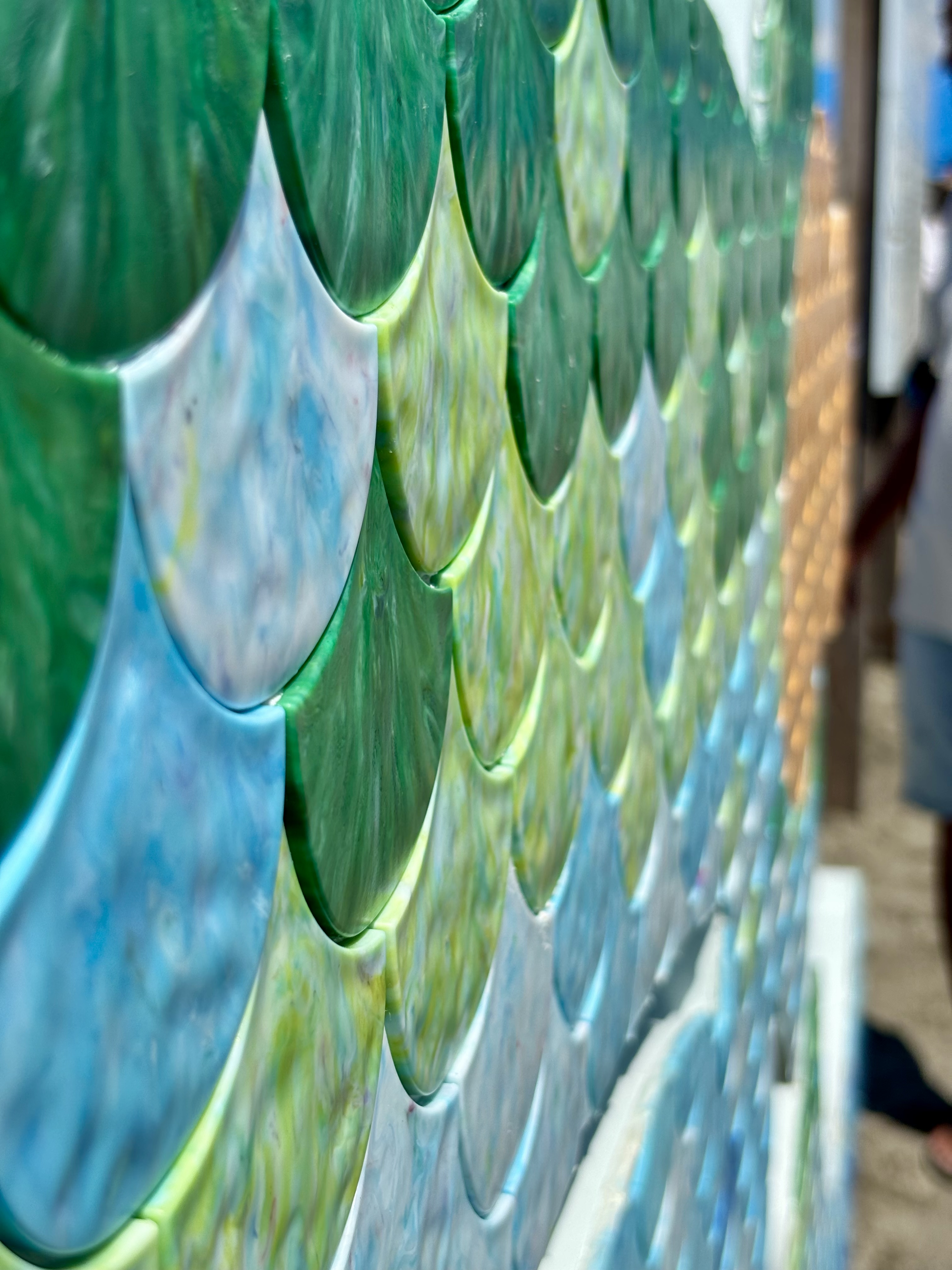 表面にキャップをアップサイクルしたうろこ状のタイル、裏面にキャップを敷き詰め、環境メッセージを風景の中に溶け込ませました。