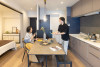 中古分譲『木場サニータウン』の一室(61.50㎡)では、キッチンとダイニングの配置を見直してリビングを拡張。さらに、ゆるやかに仕切ったサンルームや、家事動線を意識した三角レイアウト、ロボット掃除機対応の洗面室など、暮らしの流れがスムーズになるよう、工夫を考え込みました。