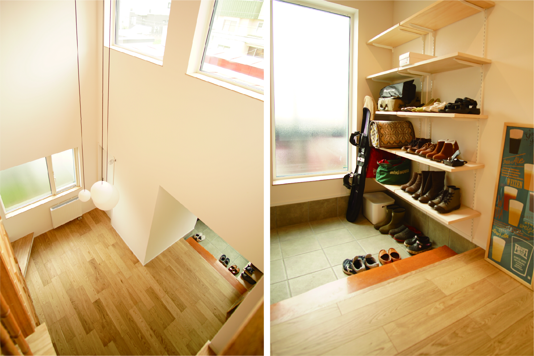 祖父母の家にあった思い出のダイニングテーブルは、玄関の“敷台”として住まいの顔になっている。床下に断熱材を施工したことで1階フロアの上がり高さが高くなり、玄関から上がるのが大変だと感じたため、敷台を設置することを提案したところ、お客様から祖父母のテーブルをリメイクして使用したいというご希望があり、設置が実現した。