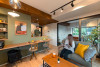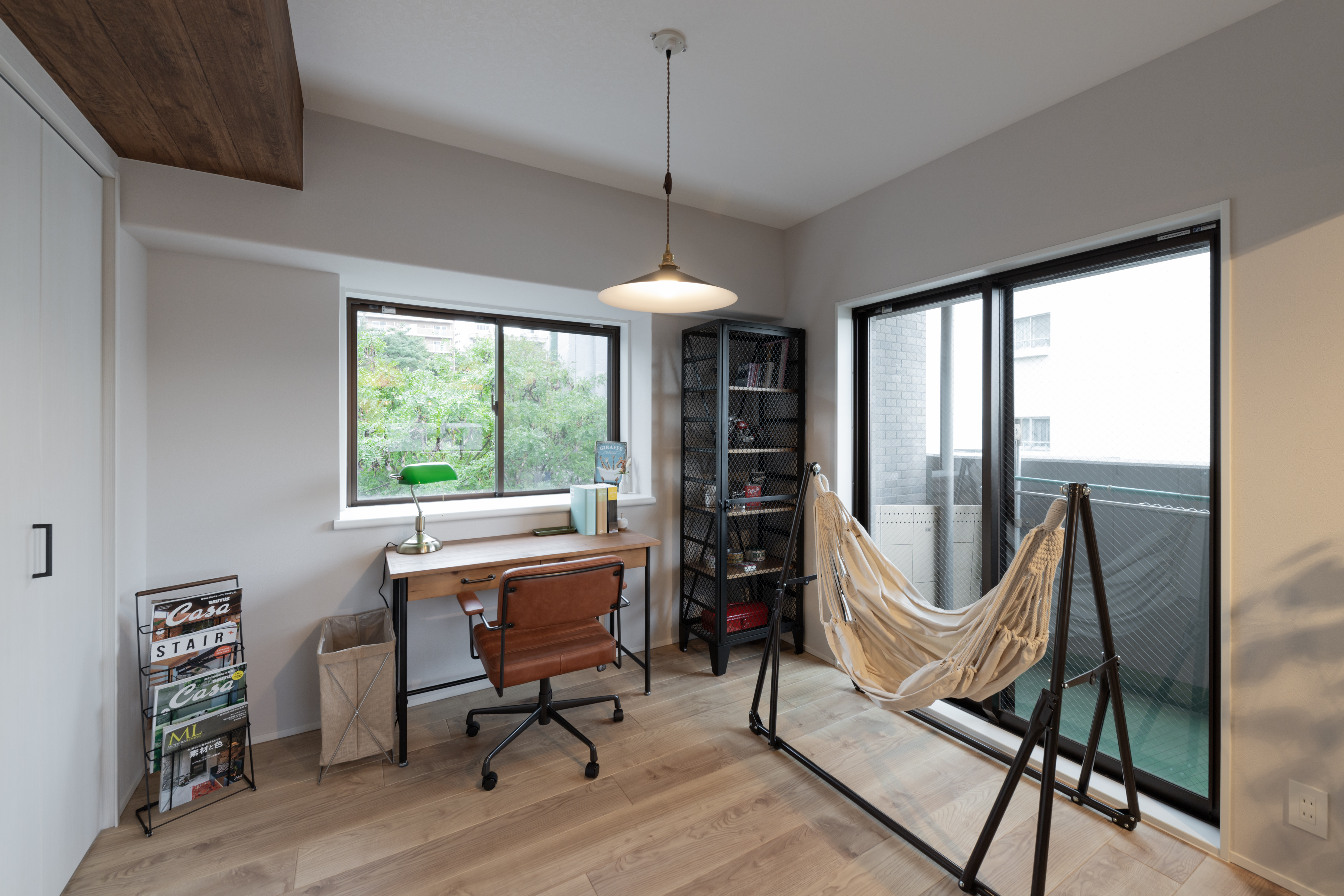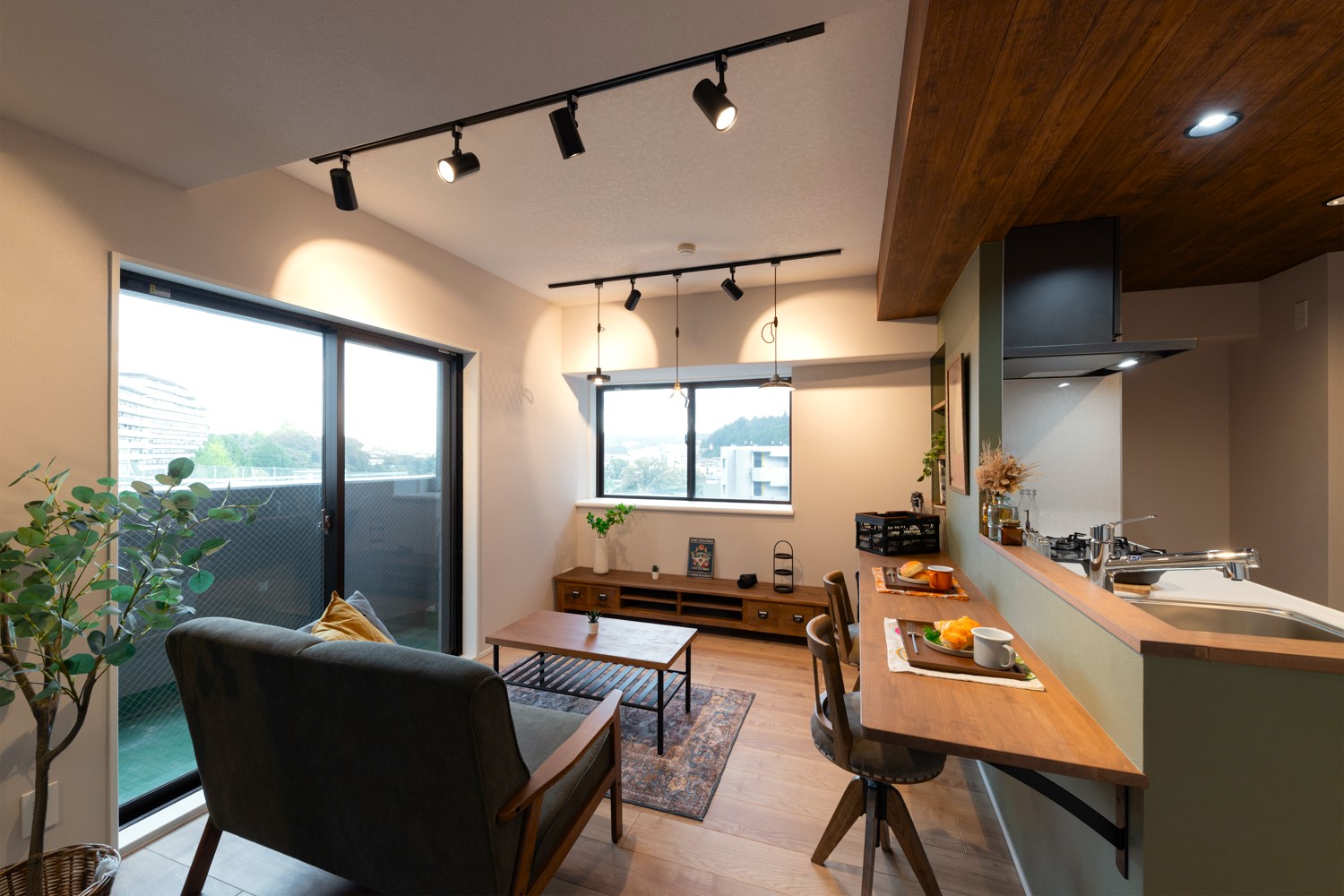 2LDKの既存マンションに対し、居住空間の快適性と開放感を高める改修を行いました。キッチンは袖壁を撤去し、リビング・ダイニングとの一体感を確保。ひとりの時間を料理や趣味に充てながらも、空間全体を心地よく使えるレイアウトとしました。隣接する居室との間仕切りはガラスの3枚引違い戸に変更し、光と視線が抜けることで開放感を演出。扉を閉じれば静かなワークスペースやゲストルームとしても利用でき、ライフスタイルに応じて柔軟に使い分けられます。