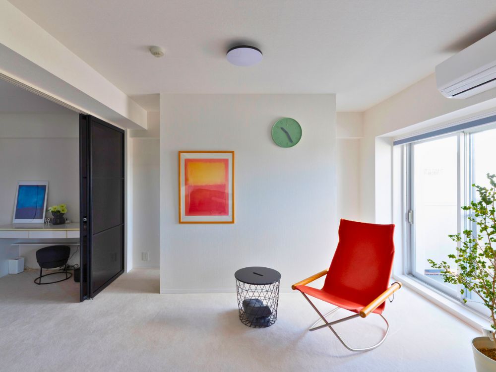 リビングの象徴的な壁の背面は収納スペースとして活用し、建具を設けずオープンにすることで生活感を排除。キッチンは壁を撤去してリビングとのつながりを重視し、さらにアクセントカラーを加えることで空間全体を引き締めています。押入は襖を撤去して塗装仕上げに変更し、軽やかで開放的な印象に。