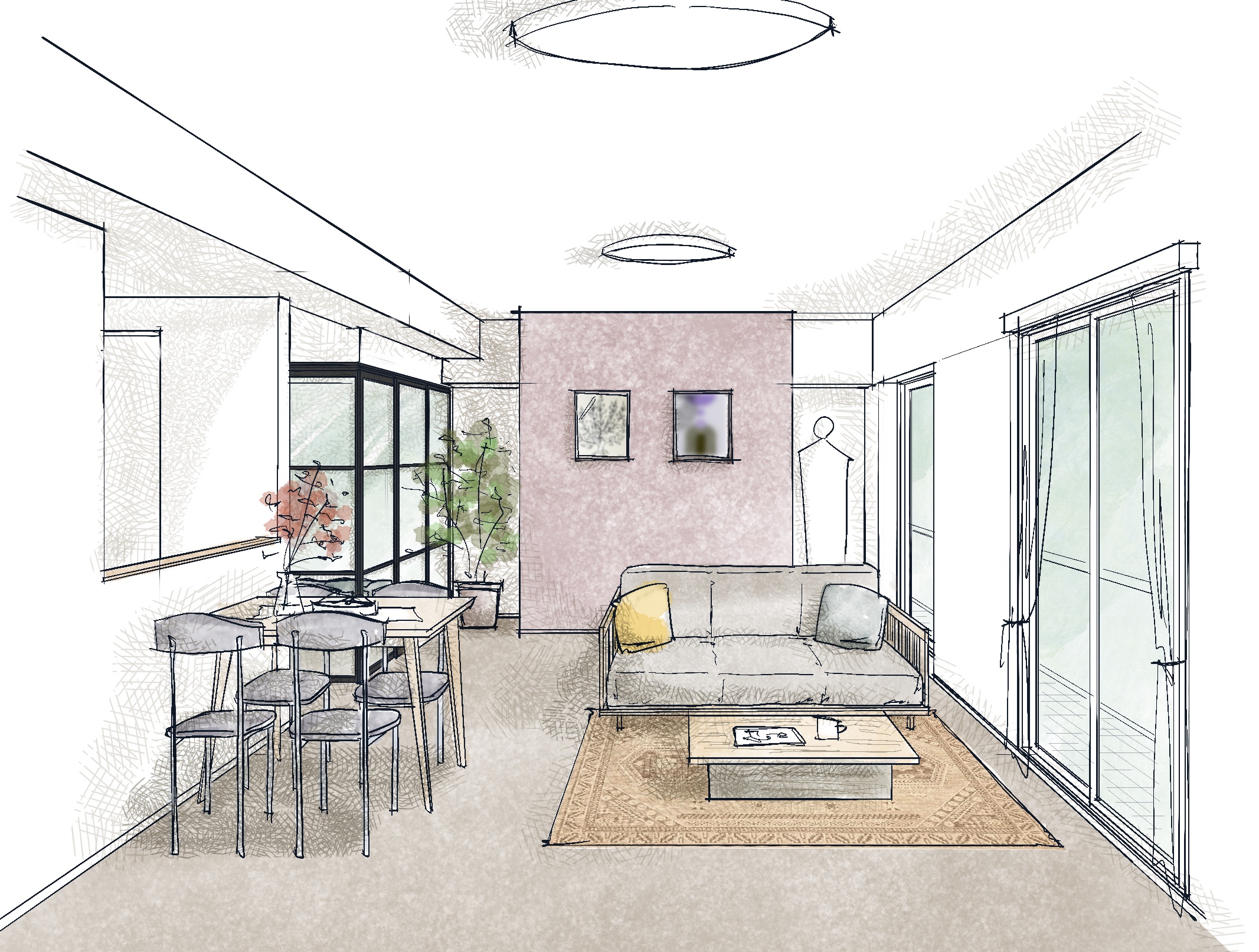 リビングの入口にはこだわりのガラスドアを採用。空間のつながりを感じさせながらも、シンプルでモダンなアクセントを加えています。また、隣接する洋室にはお客様ご手配のパネル引戸を設置予定であったため、一部に下がり壁を設けました。扉を開け放てばLDKと一体化した大きなリビングとして使え、閉じれば落ち着きある寝室として独立。暮らしのシーンに応じて柔軟に使い分けられる構成となっています。