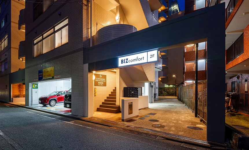 無機質なコンクリートのエントランスは、忙しい日常を送る居住者を温かく迎える空間へと刷新。2階に地域に開いたシェアオフィスを設け、居住者にとっては24時間利用可能なテレワーク、趣味勉学の場として機能し、物件内にて「自分時間」の確保を実現。
