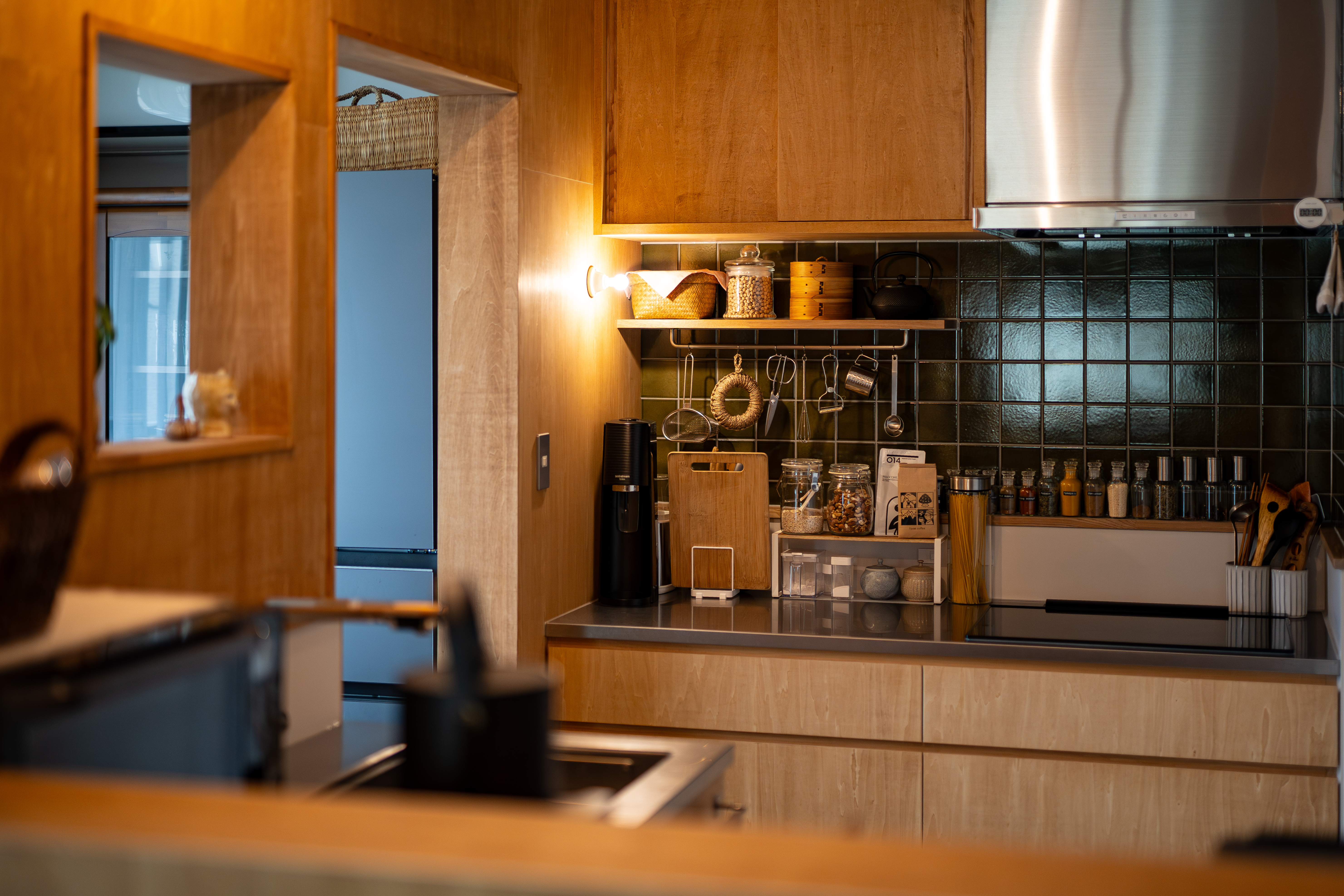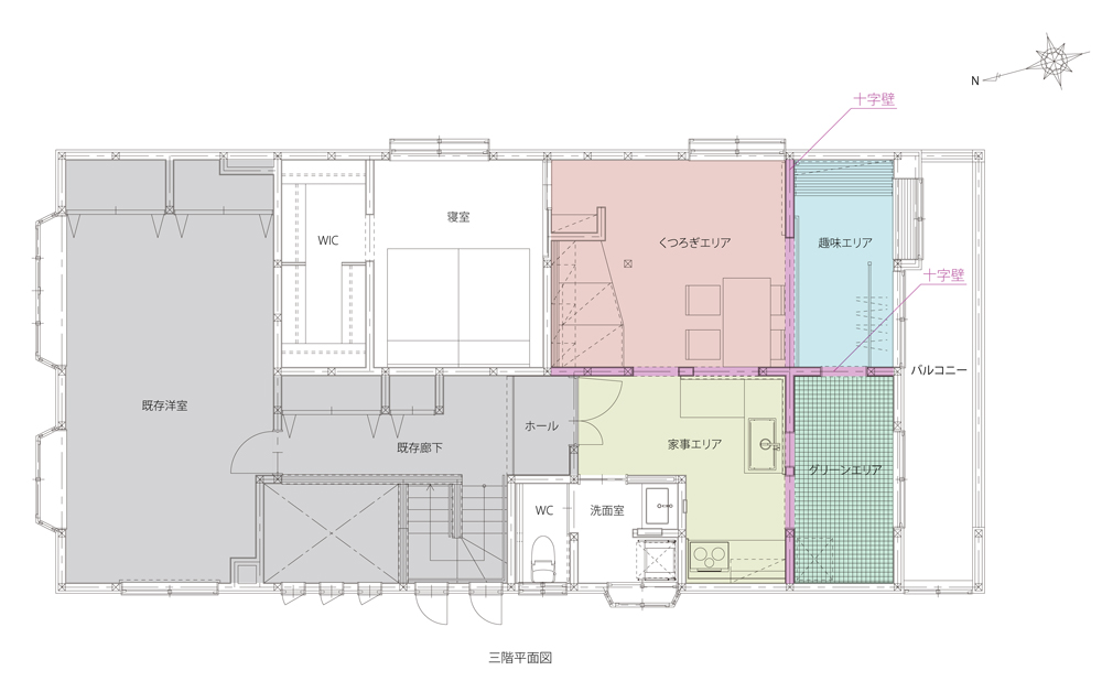 新潟県長岡市、高床式3階建ての二世帯住宅。若い世帯が暮らす3階部分、延べ床60㎡のコンパクトな部分リノベーション。LDKで観葉植物を育て、趣味の刺繍を楽しみ、家事に集中もできて、夫婦と子供の3人でくつろげる居場所が欲しい。床面積に限りがある場合、一般的には間仕切りを取り払い開放的な空間に刷新することが多い。しかし、このお家はあえて間仕切りをつくり「グリーン、趣味、家事、くつろぎ」の4エリアで構成した。4つの隣り合う空間はそれぞれの役割りを越境し合う。観葉植物を育てる「グリーンエリア」には冷蔵庫や食器棚も置かれ、刺繍をする「趣味エリア」には観葉植物も置かれ、物干しもできる。料理をする「家事エリア」ではコーヒーを淹れてくつろぐこともでき、レコードから流れる音楽を楽しむ「くつろぎエリア」では物干しをたたみつつグリーンを眺められる。「十字壁」はエリアを制限するためにつくったが、開口部から隣り合う部屋が路地裏のように見え隠れし、また役割りを越境することで自由を生むきっかけになっている。そこに家族の暮らし方や使い勝手が二重三重と折り重なり、面積以上の解放感を感じさせてくれる。「壁」をつくることが目的になると、空間は仕切られ狭く感じる。壁を「境」としてとらえると、越えた分だけ可能性が広がる。年月と共に用途や使い方も変化していくが、十字壁はその時々の暮らしに寄り添うように家族の思い出を築いていく。