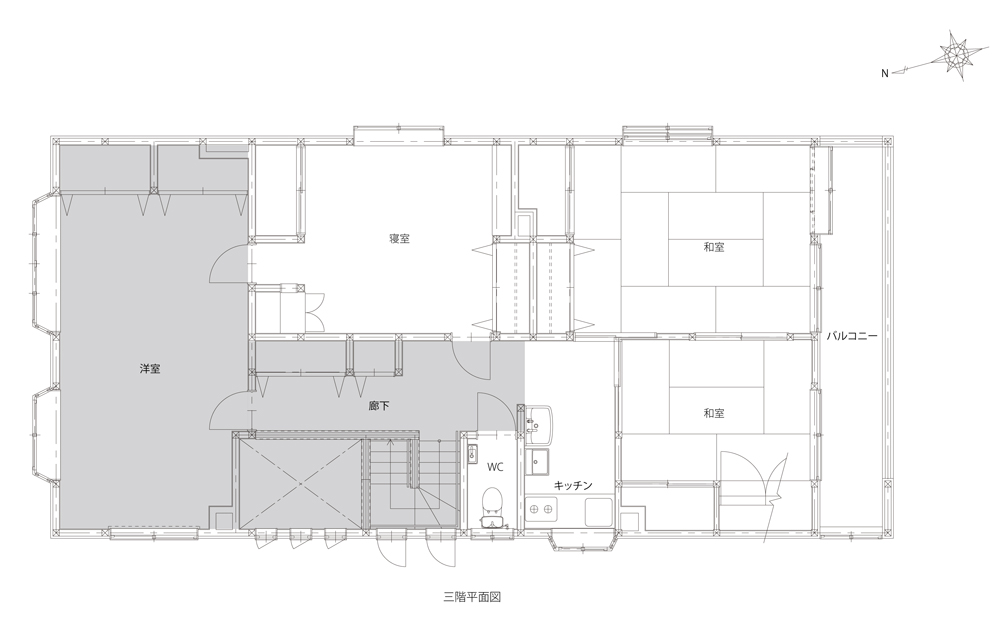 若い世帯が祖母の暮らす家に移住する二世帯住宅。一階がガレージで、二階に祖母が暮らしており、今回は三階を部分的にリノベーションする計画であった。南側は庭に面しているため明るく開放的であったが、東側はアパートとの間隔が狭い上に窓の位置が干渉しており採光が期待できない。西側は元々窓が少なく、現況を活かした改装のため採光がとれない状況であった。南側の採光が部屋の奥まで届くように、間仕切り壁を取り払い広いワンルームにする必要があった。ただ、新潟の冬はとても寒く、夏も年々平均気温が上昇している。現状の性能では不安が大きかったため、三階ワンフロアをゾーン断熱することで問題を解消していった。直下に祖母の暮らすリビングがあるため、床の断熱が防音材としても一役買っている。仲のいい祖母と孫がお互いにいい距離感を保ちつつ、「住み慣れた家」の良さと「移住」という変化のバランスを考慮した計画が必要であった。