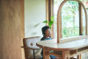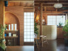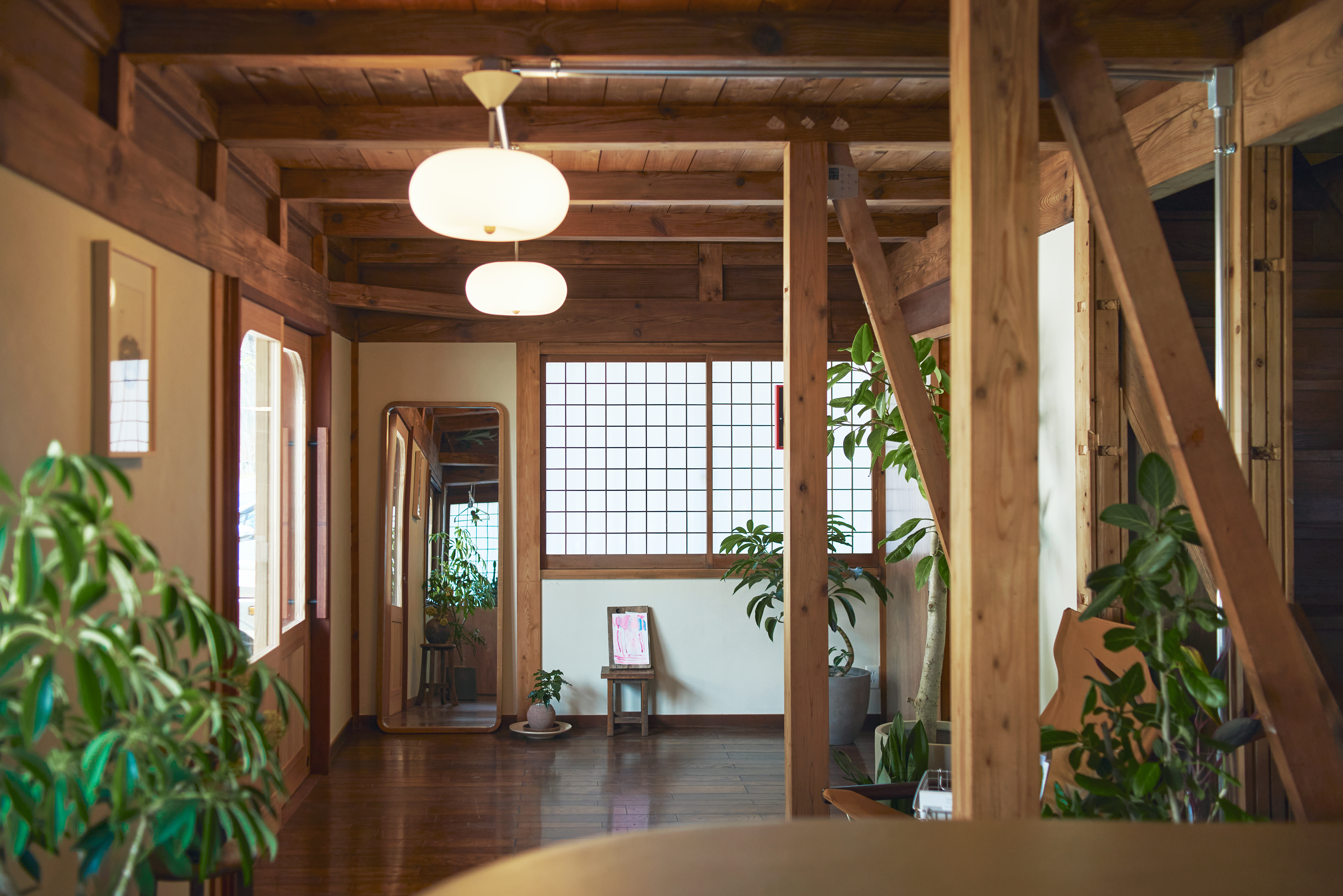 敷地北側に建つ小さな木造の設計事務所は、同じ外観を持つ自宅と庭を挟んで隣り合っている。瓦屋根と深いベンガラ色の木部が印象的な和風建築で、内部は経年した梁や柱が現れ、建築士であった義父の仕事や個性が随所に感じられる空間だった。