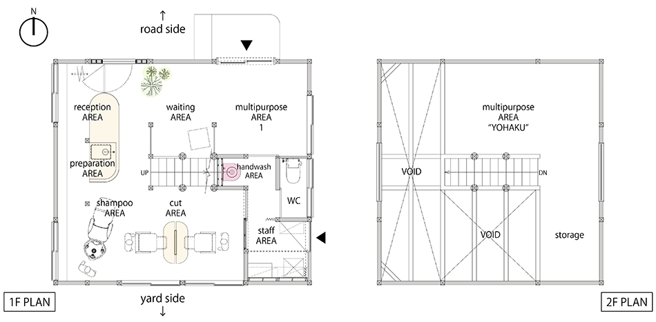 この建物には義父の仕事が随所に宿っている。義父の仕事を目に見えるカタチで残すため吹抜を設け、広がりのある空間とした。吹抜があることで上下の空間が繋がり、2階を新たな営みの中の“余白”とした。 “余白”には施主の奥様が好きなアートや雑貨を設え、お花を見立てる営みもいつか始まるかもしれない。そして新しい営みの場を周囲に開くため路面側に新たな入口を設けた。カットエリアは義父と家族が大切にしていた庭に面して配置。庭の緑と光、移ろう季節、生前愛でた風景をお客様と分かち合えたら義父はきっと喜ぶだろう。