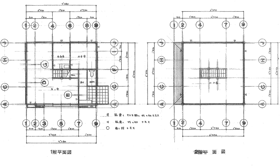 間取りは階段を中心に据え、1階は作業室・打合室・図面庫・ミニキッチンが囲み、2階は収納に使われていた小屋裏があった。1階と2階の繋がりは感じにくく、2階は屋根裏のような薄暗い閉鎖的な空間だったが、階段を上がると板張りの勾配天井が四角錐状に広がり、独特な伸びやかさを持っていた。庭は生前義父が大切にされていた場所で、建物と家族の記憶を結び付ける象徴的な存在のようだった。
