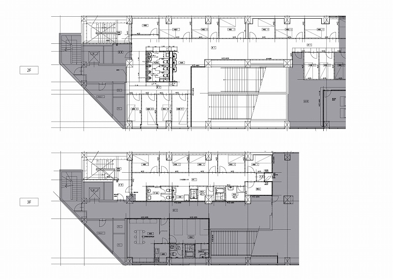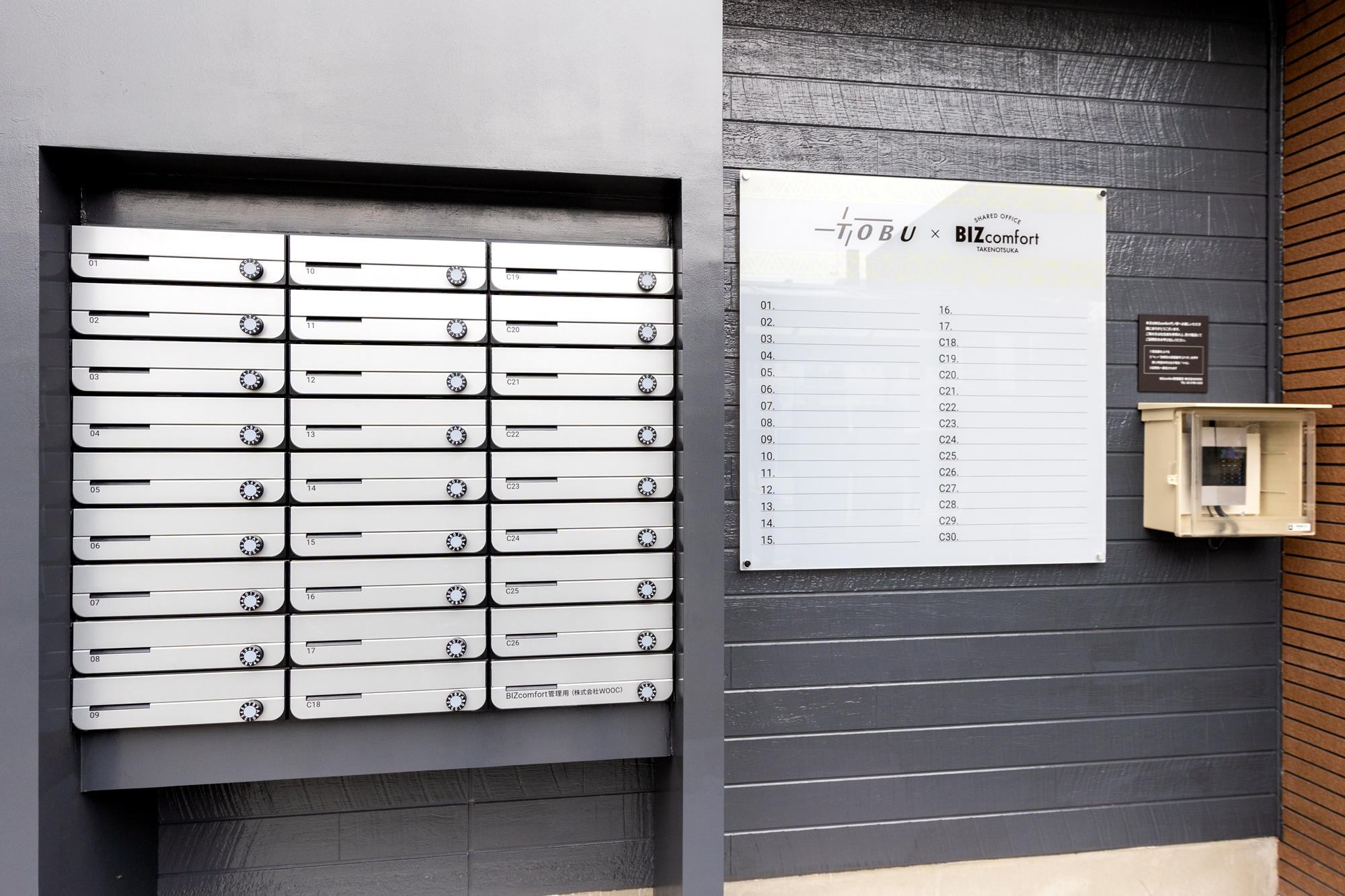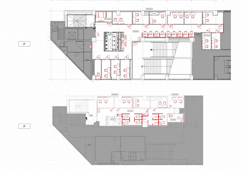 かつての駅階段はそのままエントランスへの動線として活用、壁面に駅看板を思わせる意匠を加えることで懐かしさに加えワクワク感を演出。仮泊所の個室空間は、一部を除き既存の間取りを最大限活用し16戸のレンタルオフィスへと転換した。