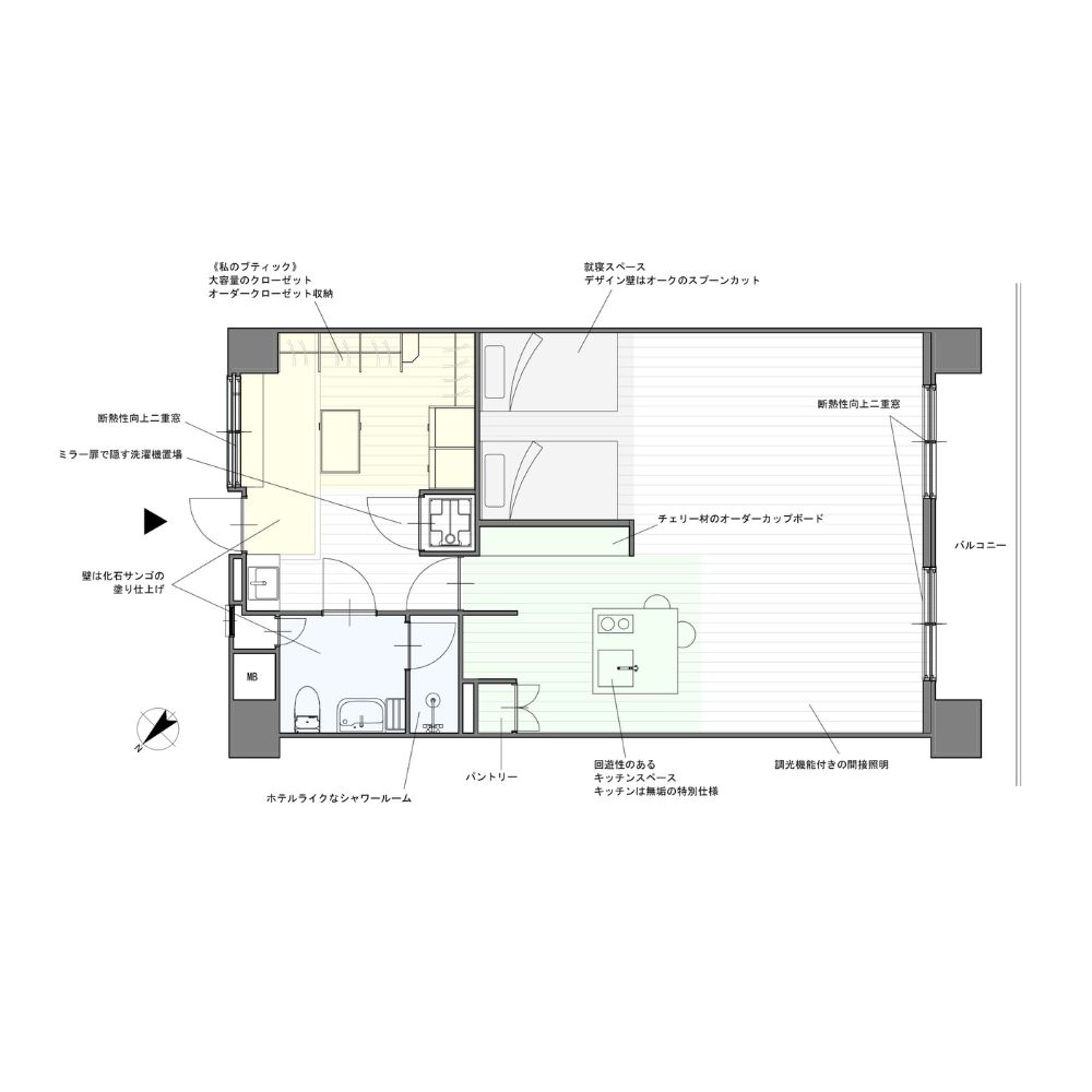 塗壁と建築化照明、無垢材など素材とディテールで質感を高めつつ、給排水管や断熱材、二重遮音床の更新、Low-E二重窓新設といったインフラ改修を施し意匠と性能を両立。ブティックライクの造作クローゼットや水廻りは二拠点として所有する悦び・ゲストを招きたくなる空間とした。