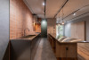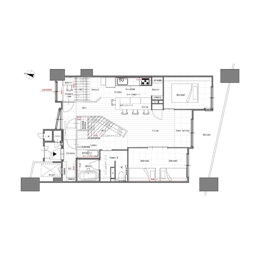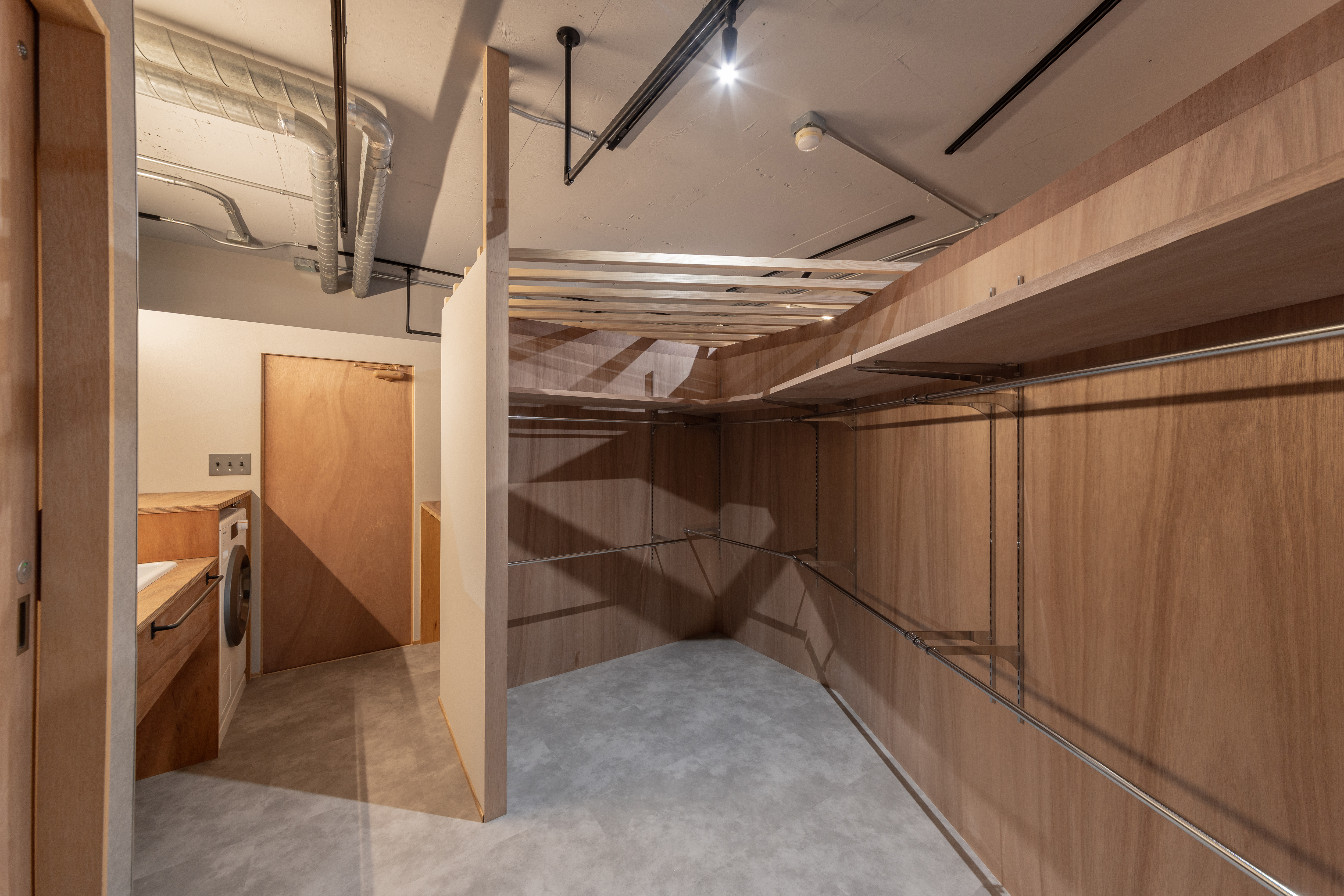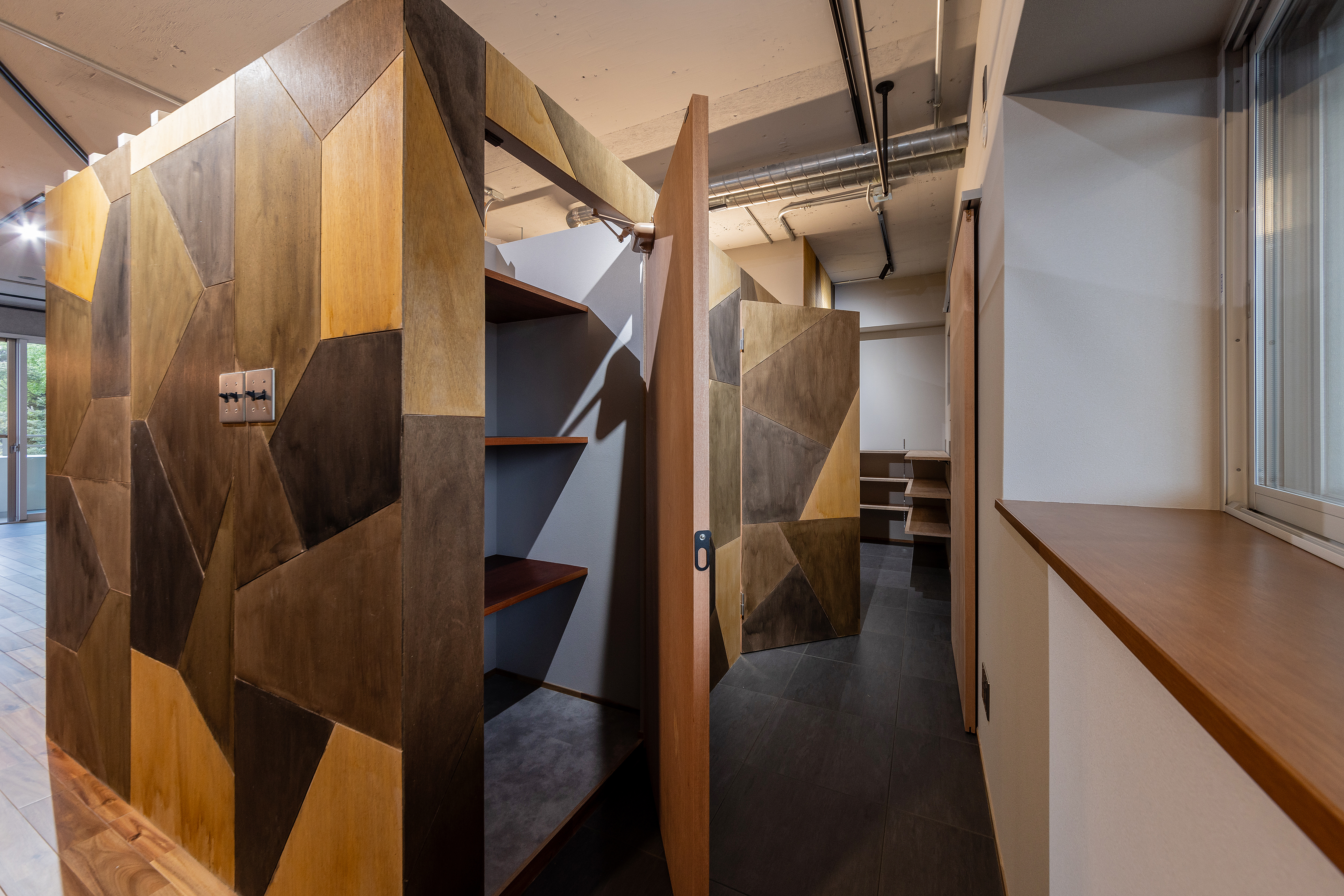 建物横の公園緑や光を室内に取り込むべく、玄関土間や水廻りからバルコニーまで視線の抜けと動線を連続させています。爬虫類のメンテナンスができる玄関土間や書斎など個の領域がシームレスにつながり、壁上部を開放することで家族の気配と明るさが感じられます。洗面・浴室・WICは回遊動線とし、大判ステンレス天板の造作テーブルは勉強や作業・団らんを兼ねる場とするなど機能も検討を重ねています。鋼管やレトロスイッチなどの工業的ディテールと、無垢材や造作建具の質感を強調させるために通常は隠される木口や積層面をあえて見せる仕上げを採用しました。